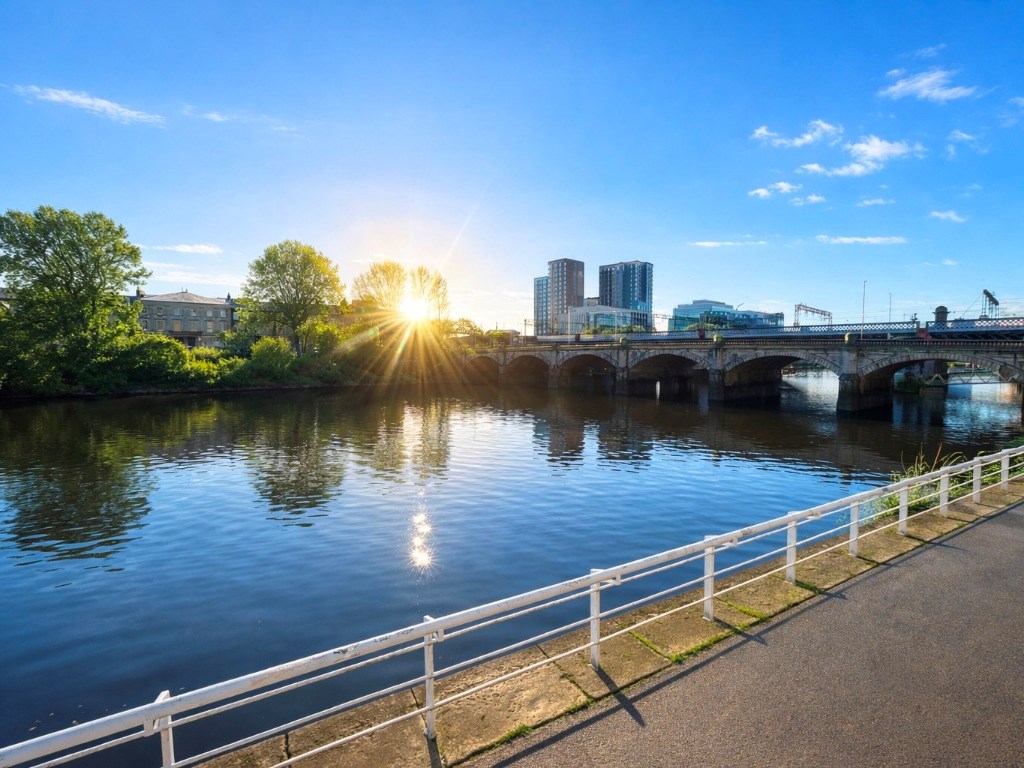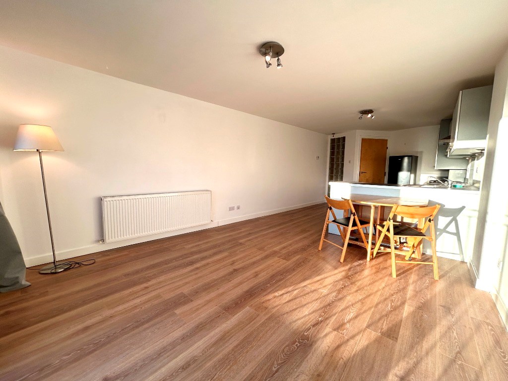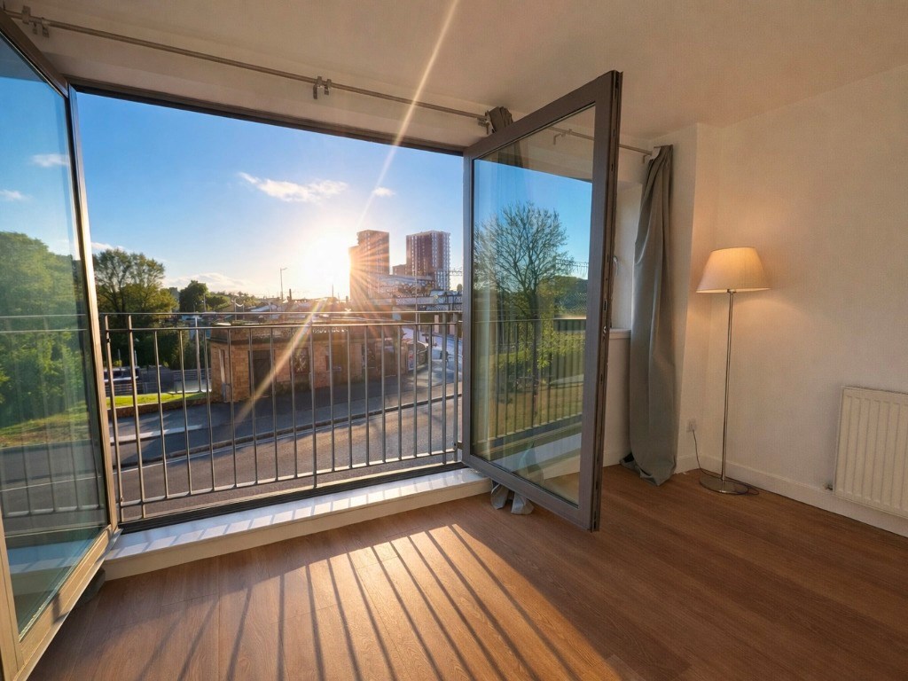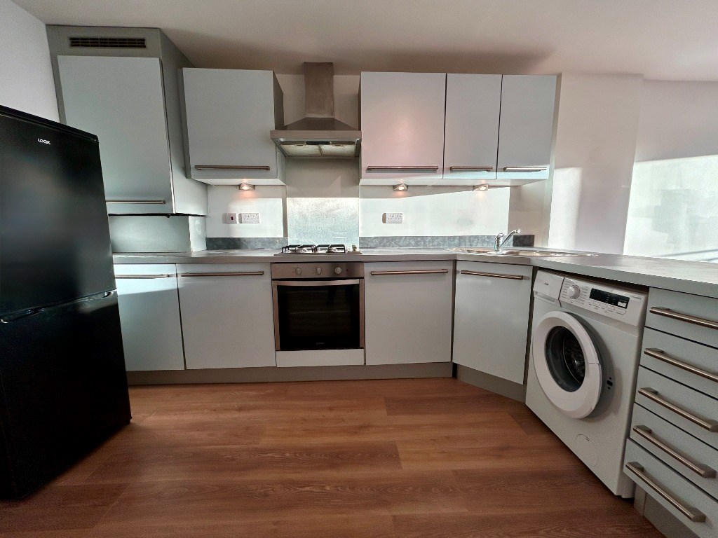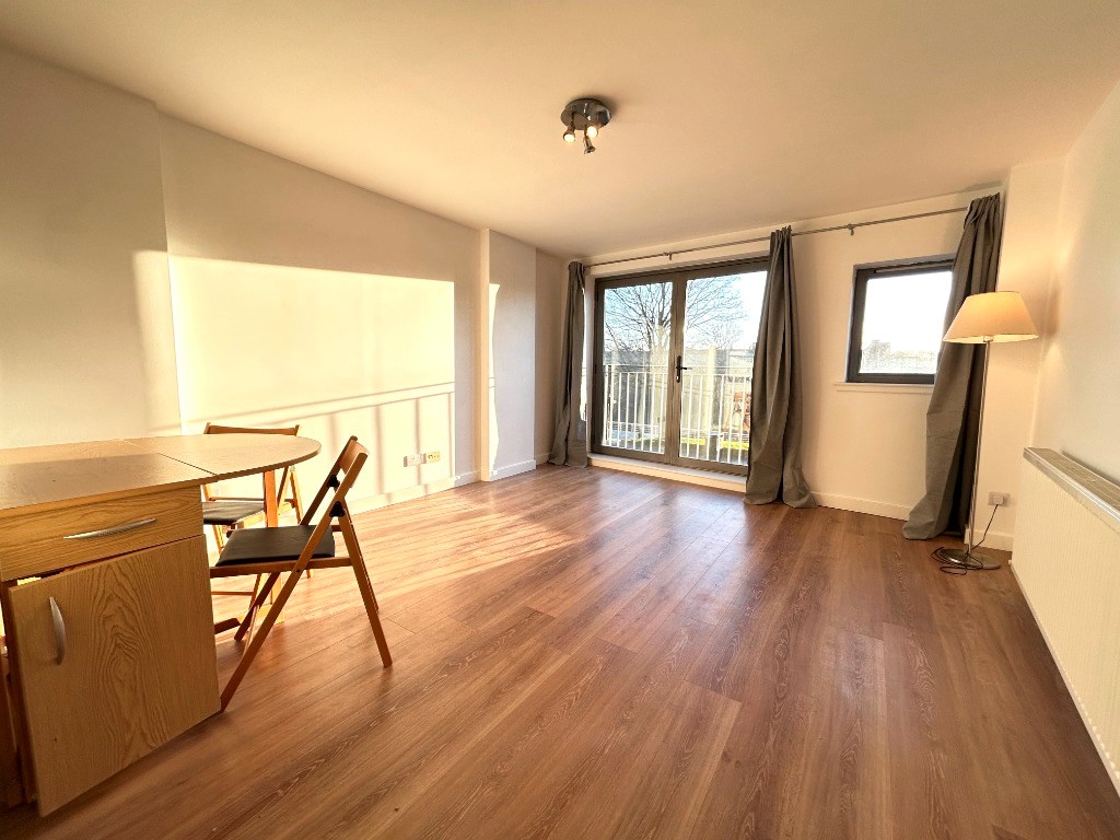 The accommodation comprises a welcoming entrance hallway with useful storage, leading through to a bright and spacious open-plan lounge and kitchen. This impressive living space is enhanced by large windows and a Juliet balcony, allowing for an abundance of natural light while providing a pleasant outlook over the river and surrounding cityscape. The modern kitchen is well laid out and offers ample workspace and storage, making it both practical and stylish for everyday living.