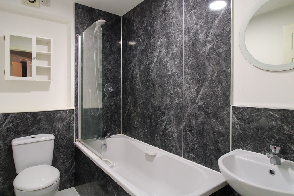 BATHROOM  There is a modern three piece white suite with shower over bath and marble effect back splash.
