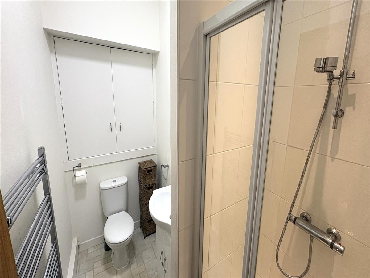 This studio flat (combined lounge/bedroom) comprises; Entrance hallway; Lounge with two storage wardrobes and foldaway bed hidden behind a further wardrobe; Kitchen with dining area, washing machine & fridge freezer and storage cupboard; bathroom with shower cubicle over the bath.