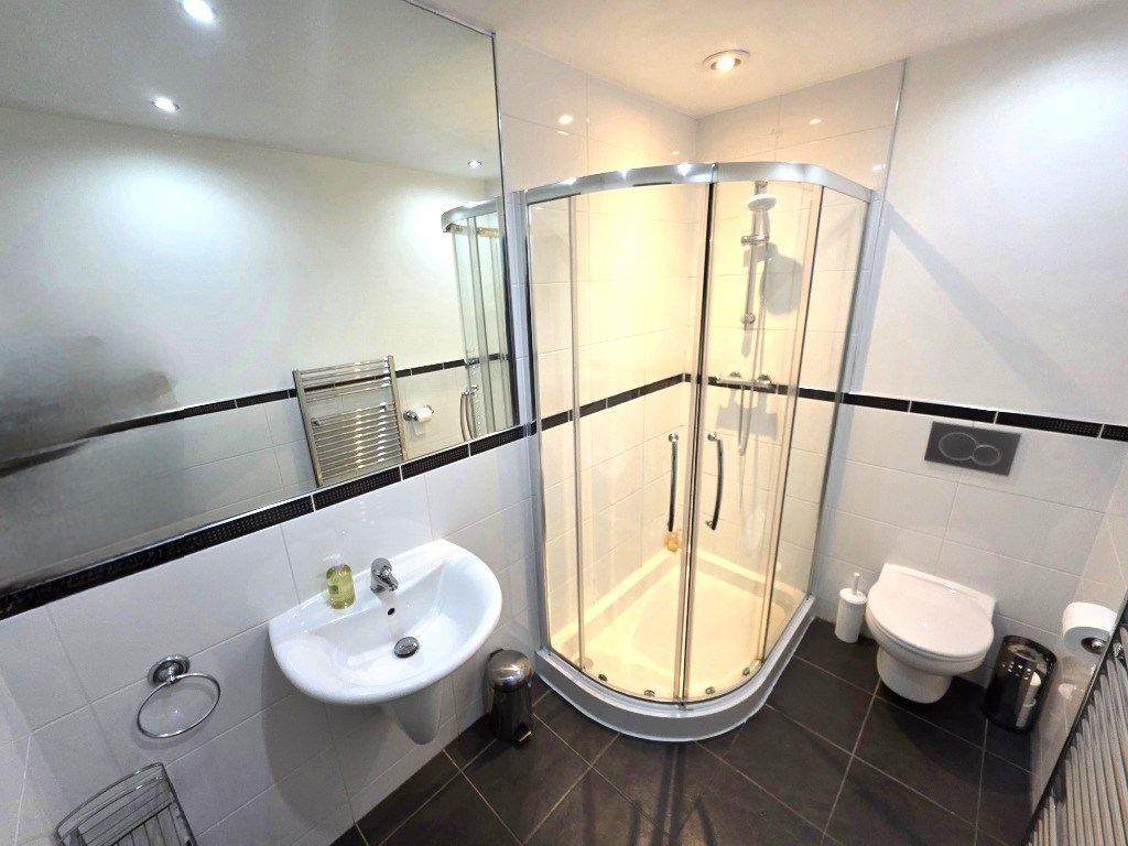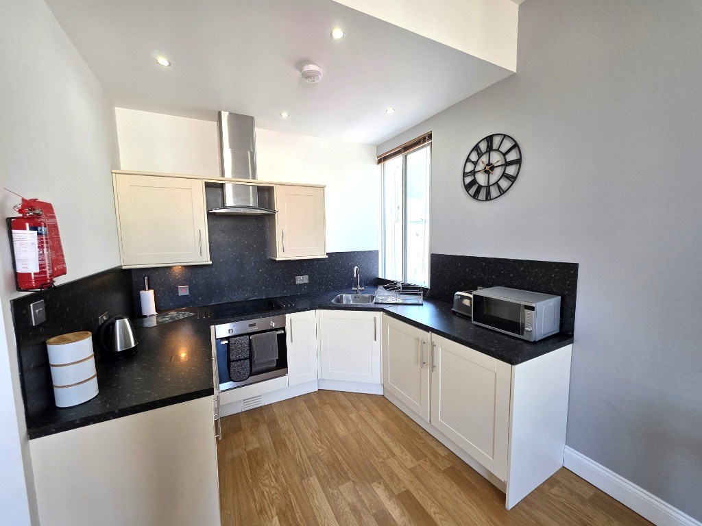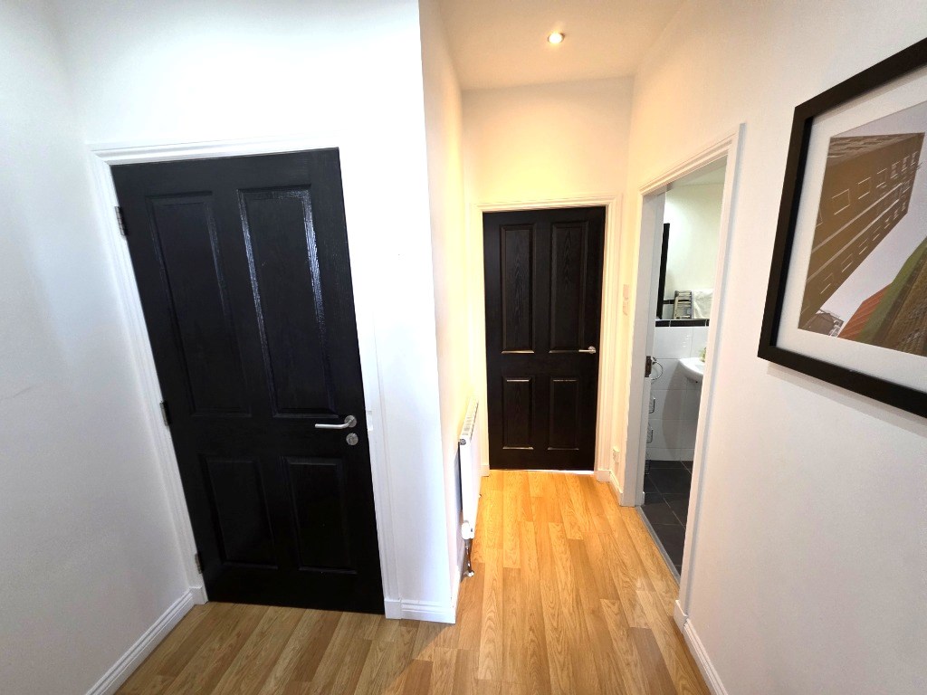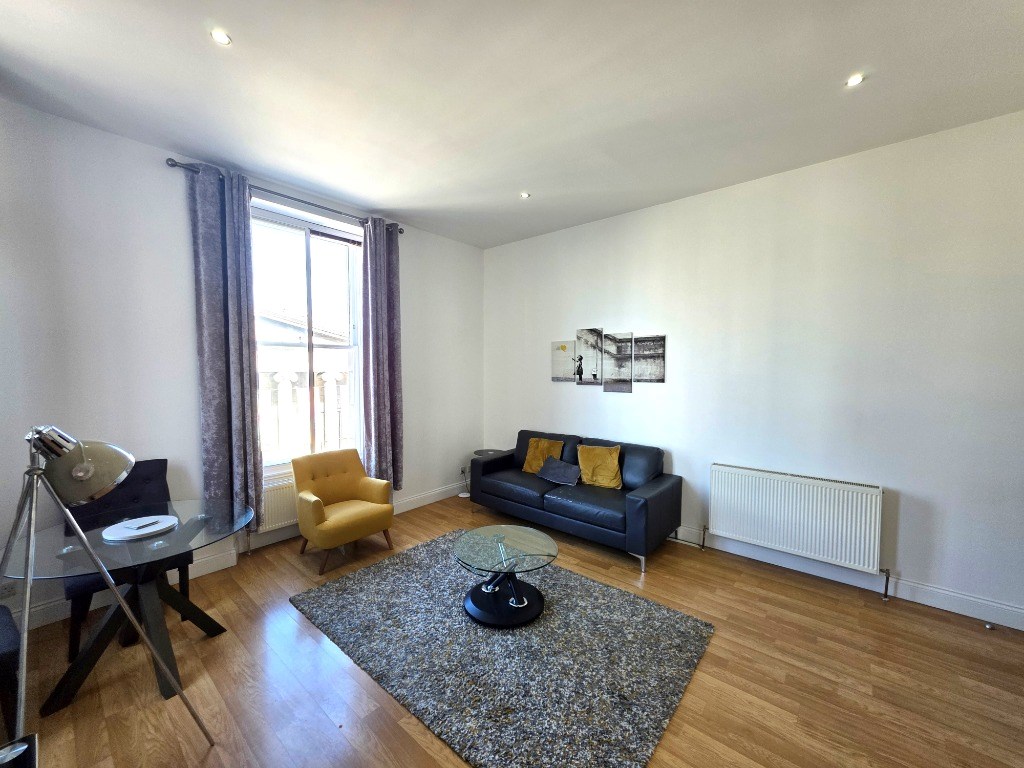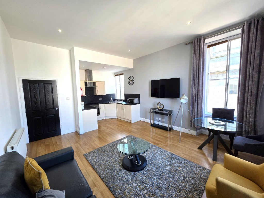 Spacious, open plan, Kitchen, Living, Dining room with views out over Union Street: Modern Shower room: Double bedroom with storage: Hall.