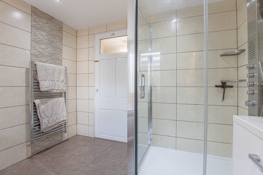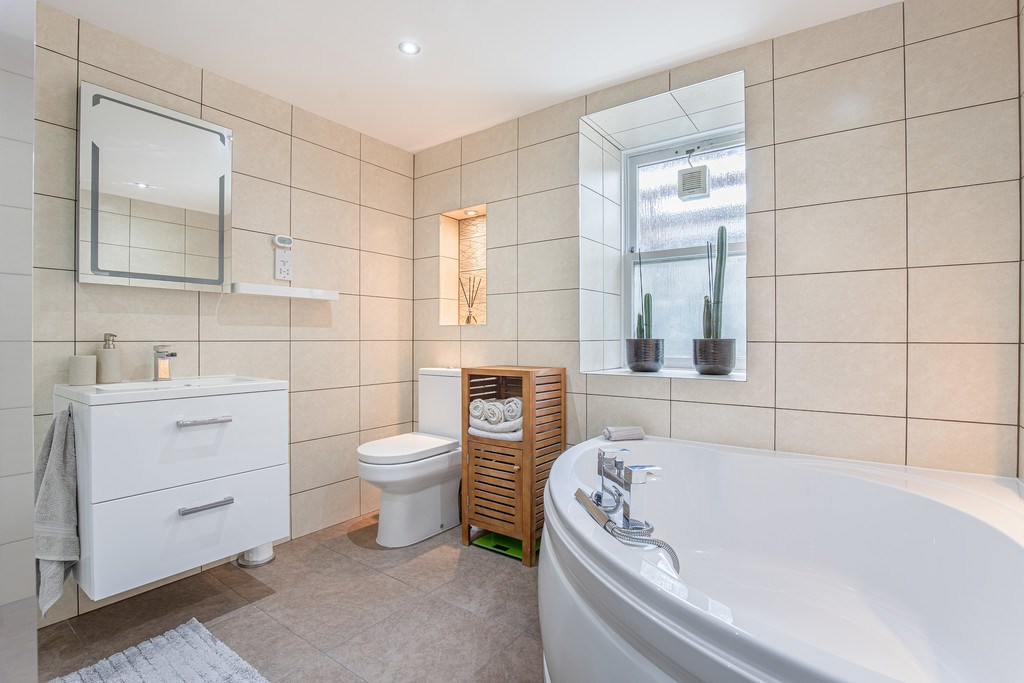 FAMILY BATHROOM The family bathroom is stylish and contemporary, finished to a high standard with modern tiling throughout and a clean, neutral colour scheme. It features a luxurious corner bath and a separate glass-enclosed shower, offering both comfort and practicality. Underfloor heating ensures a warm and inviting atmosphere year-round, complemented by a sleek vanity unit with built-in storage, a heated towel rail, and recessed shelving that add to the polished look and functionality. Bright and spacious, this bathroom provides a relaxing space with a spa-like feel.