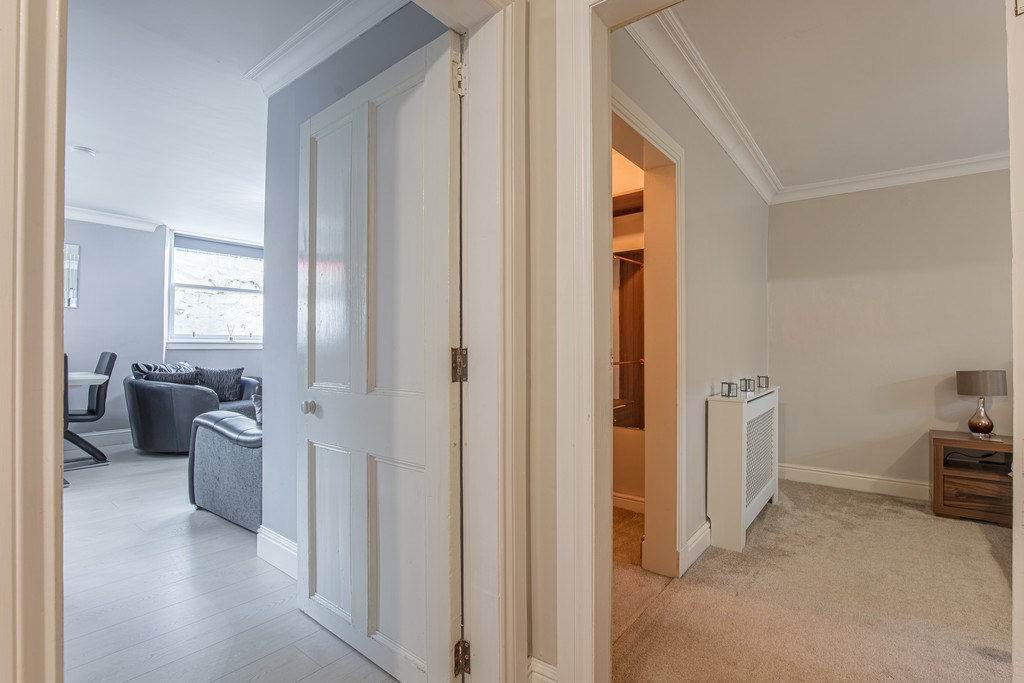 BEDROOM 1 Spacious and elegantly presented double room, decorated in soft neutral tones that create a calm and relaxing atmosphere. The space comfortably accommodates a large bed and additional furniture, while the window allows for good natural light. A standout feature is the generous walk-in wardrobe, offering excellent storage and organisation space, making this bedroom both stylish and highly practical.