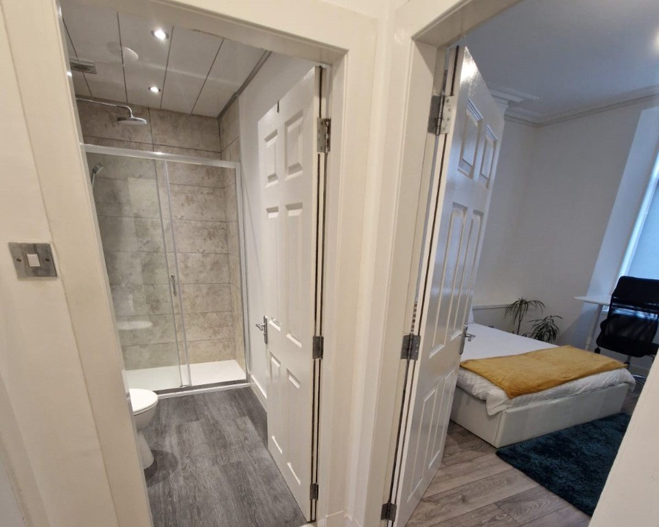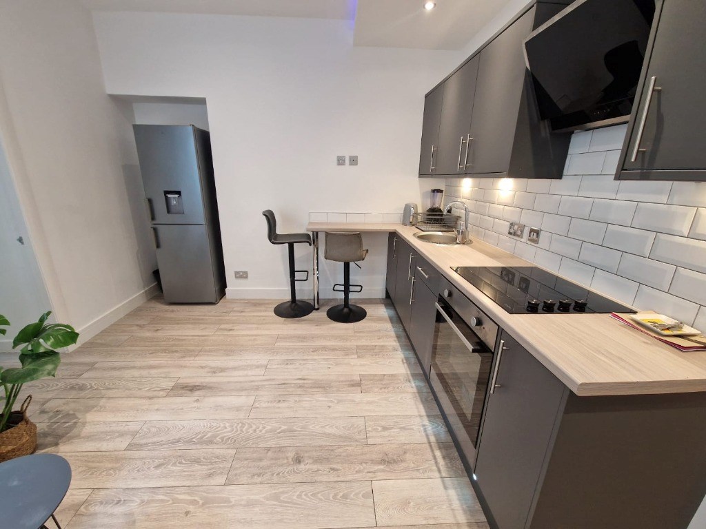 This lovely property has been refurbished to a high standard throughout. The airy lounge, kitchen and dining area is decorated to a high standard with stylish furnishings including a corner sofa. The open plan kitchen benefits from dark grey fitted units and a breakfast bar for dining. The kitchen contains all of the usual modern appliances including a gas hob, oven and fridge freezer. Located off of the kitchen is bedroom 2 which contains freestanding wardrobes and a desk. The spacious master bedroom contains fitted wardrobes and a desk. Completing the accommodation is the modern shower room which also houses the washing machine.