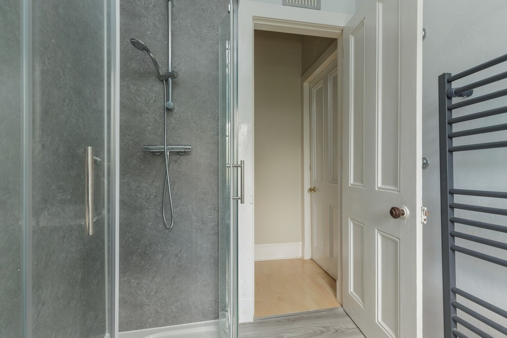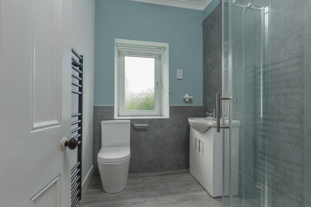 BATHROOM Traditional three piece white suite with shower cabin.