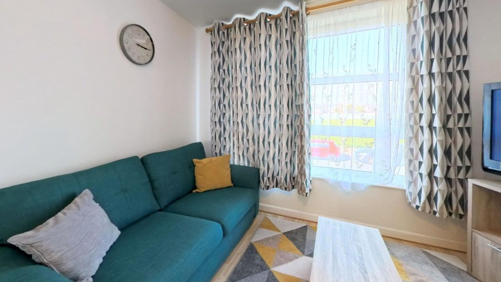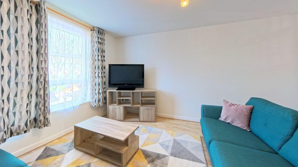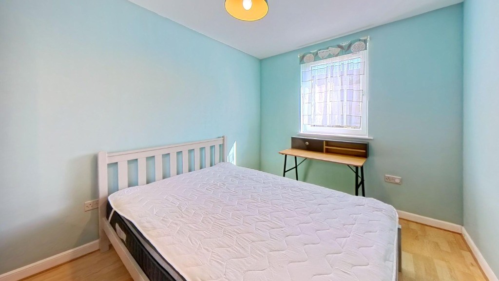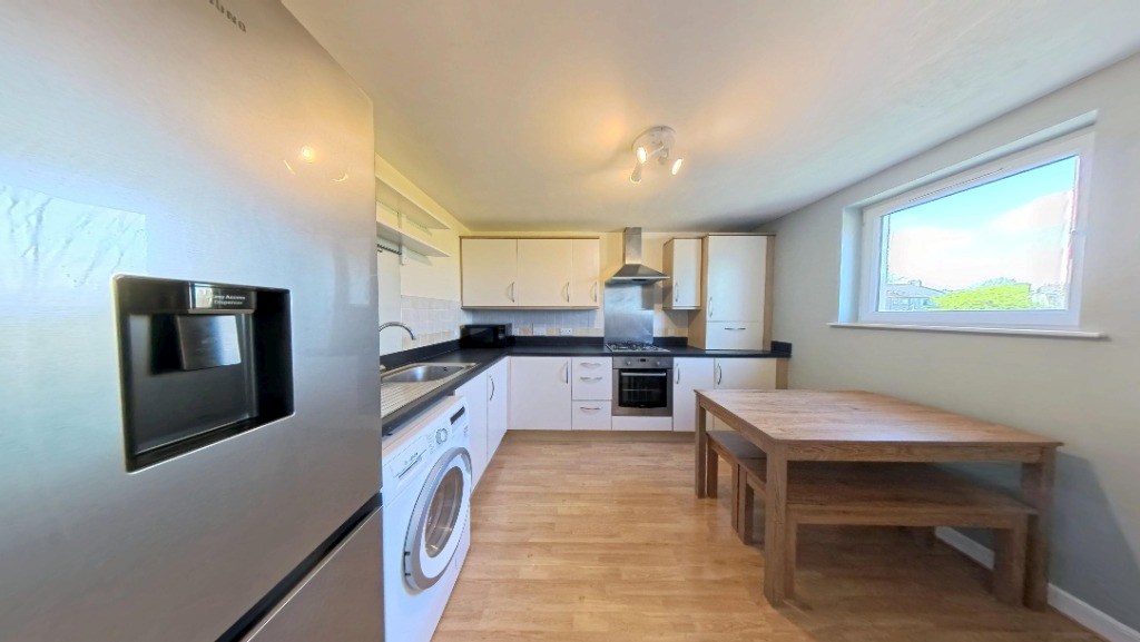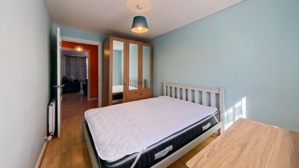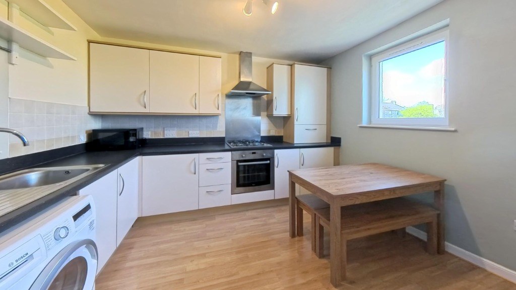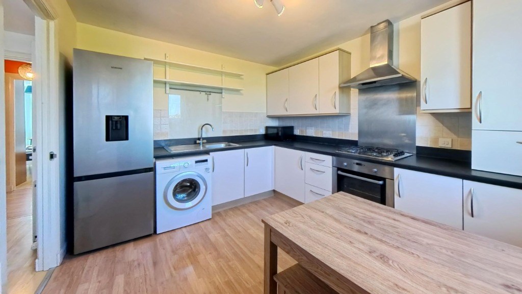 Located at 38D Erroll Street, Aberdeen, this single-floor flat offers 51 square metres of well-organised living space comprising two bedrooms, one bathroom, a living room, kitchen, and hallway. The kitchen is fitted with white gloss cabinetry, dark worktops, a stainless steel extractor hood, gas hob, oven, integrated dishwasher, washing machine, and fridge-freezer, all set on light wood-effect flooring. A dining table with bench provides an informal eating area within the kitchen. The living room is a bright, welcoming space benefiting from a large window with feature curtains, light wood flooring, and a comfortable layout. The primary bedroom measures 10 square metres and features built-in mirrored sliding wardrobes, wood flooring, and a neutral colour scheme. The second bedroom is decorated in soft blue tones, with a built-in mirrored wardrobe, wood flooring, and a window allowing natural light. A third variation of the second bedroom presents a light lavender palette with a window and desk area. The bathroom is fully tiled with dark floor tiles, and features a bath with overhead shower, WC, vanity unit with basin, and a mirrored cabinet. Throughout the flat, light wood flooring provides a consistent, clean aesthetic.