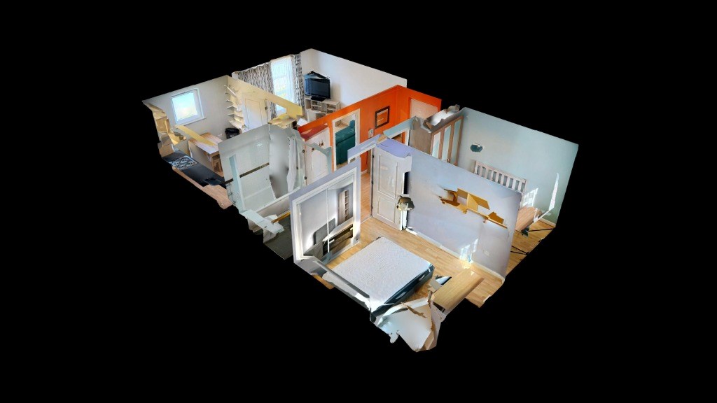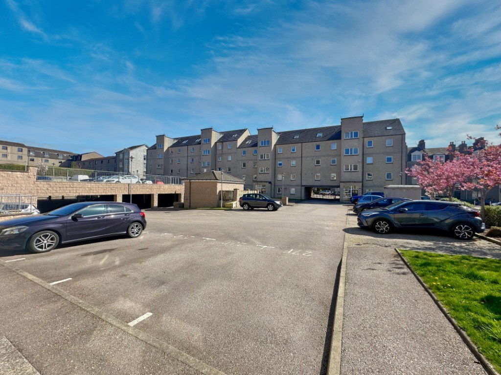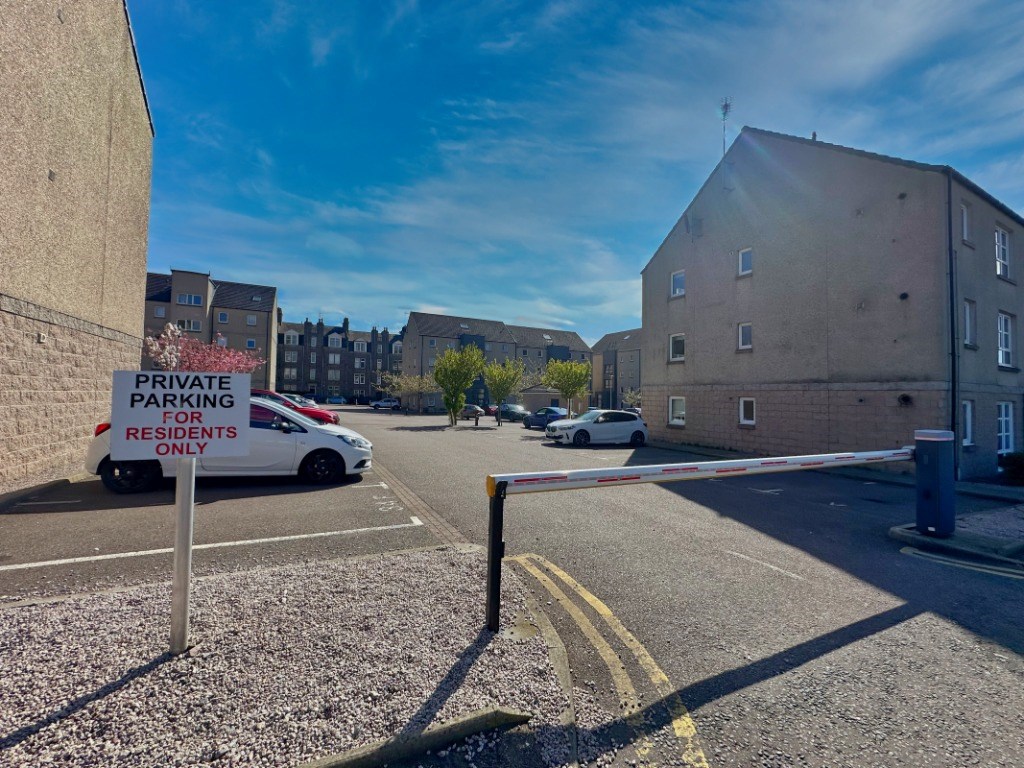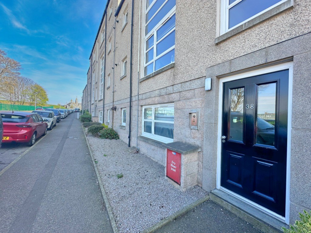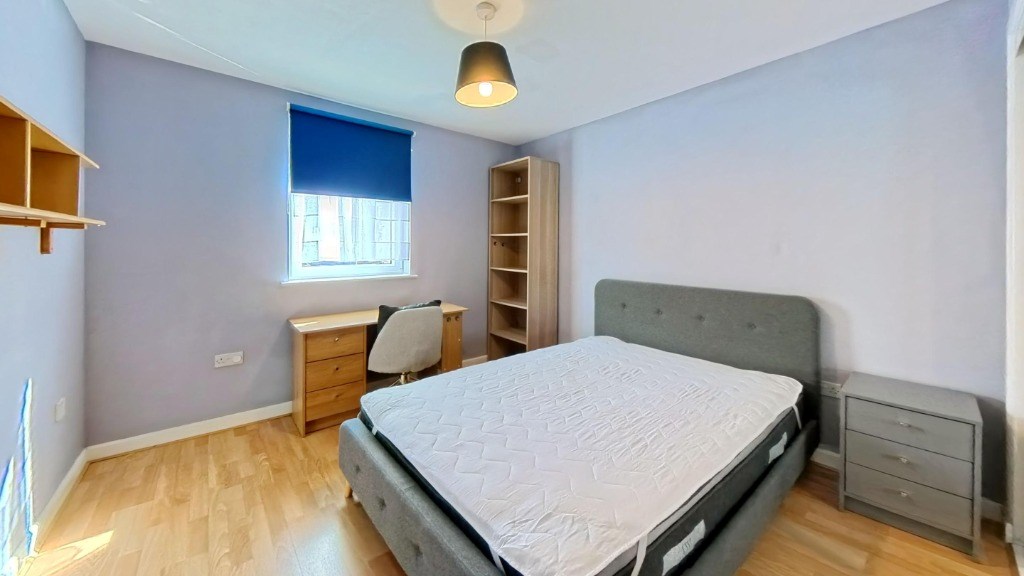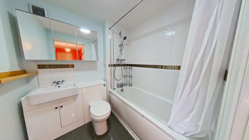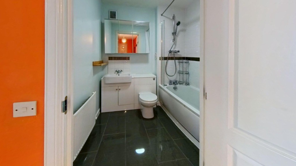 Located at 38D Erroll Street, Aberdeen, this single-floor flat offers 51 square metres of well-organised living space comprising two bedrooms, one bathroom, a living room, kitchen, and hallway. The kitchen is fitted with white gloss cabinetry, dark worktops, a stainless steel extractor hood, gas hob, oven, integrated dishwasher, washing machine, and fridge-freezer, all set on light wood-effect flooring. A dining table with bench provides an informal eating area within the kitchen. The living room is a bright, welcoming space benefiting from a large window with feature curtains, light wood flooring, and a comfortable layout. The primary bedroom measures 10 square metres and features built-in mirrored sliding wardrobes, wood flooring, and a neutral colour scheme. The second bedroom is decorated in soft blue tones, with a built-in mirrored wardrobe, wood flooring, and a window allowing natural light. A third variation of the second bedroom presents a light lavender palette with a window and desk area. The bathroom is fully tiled with dark floor tiles, and features a bath with overhead shower, WC, vanity unit with basin, and a mirrored cabinet. Throughout the flat, light wood flooring provides a consistent, clean aesthetic.