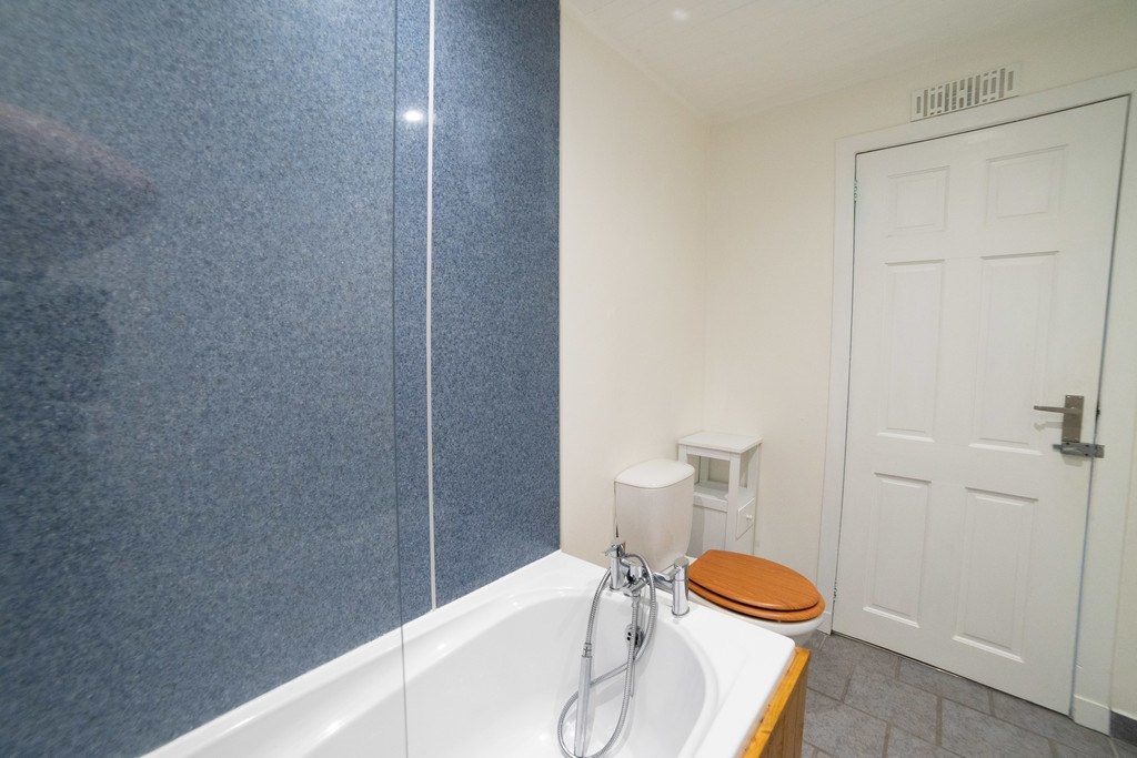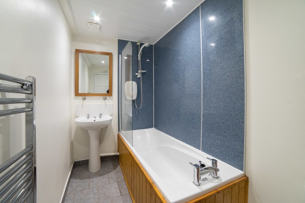 BATHROOM Fantastic sized bathroom with shower over bath with blue aqua panelled surround. Tiles floor and heated towel rail completes this room.