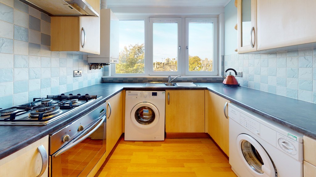 KITCHEN Stylish modern kitchen decorated in neutral tones with wooden wall and base units and black countertops. The kitchen benefits from a gas hob/oven, washing machine, dryer, and a full-sized free-standing fridge/freezer. This kitchen is ideal for the enthusiastic cook!
