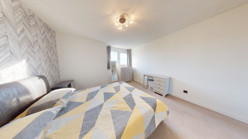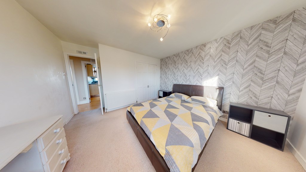 BEDROOM 1 Large double bedroom decorated to a high standard with a chest of drawers, dressing table, two bedside tables and a matching bedframe. Large built-in wardrobe provides good storage. The room also contains a large window which allows plenty of light into the room.