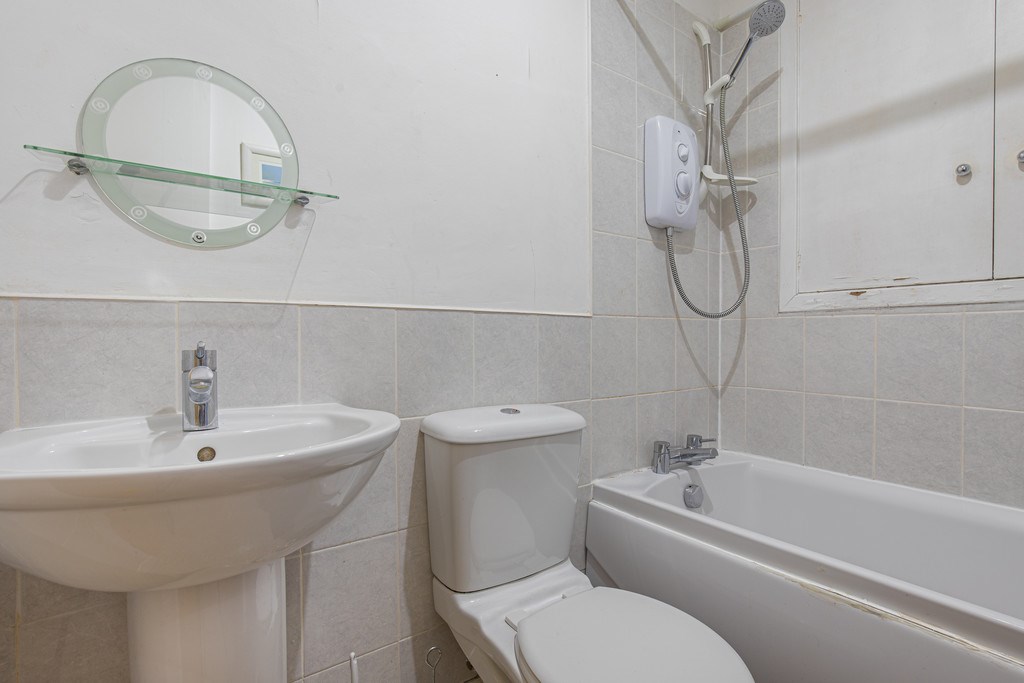 BATHROOM A Beautiful modern three piece suite with shower over bath and grey tiles.