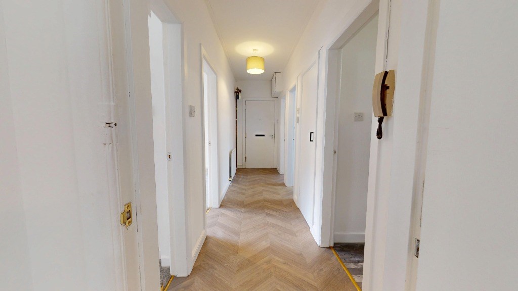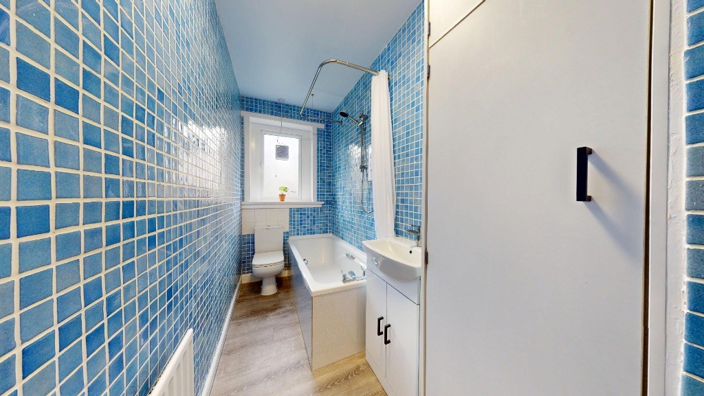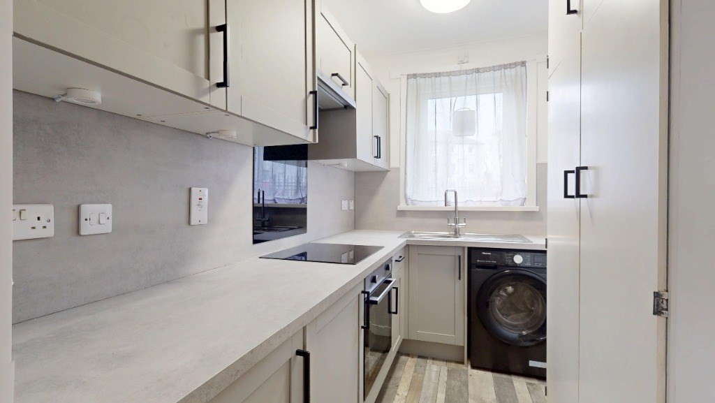 This well-appointed flat at 2E Froghall Gardens, Aberdeen, offers 732 sq. ft. of living space on a single floor. The property boasts three bedrooms, including a spacious primary bedroom of 183 sq. ft. The modern kitchen is a standout feature, with sleek white cabinetry, integrated appliances, and a practical layout that includes space for a washing machine. The bathroom is a visual delight, adorned with vibrant blue tiles that create a refreshing atmosphere. It features a full-sized bathtub, toilet, and sink with storage underneath. Throughout the flat, neutral-toned carpeting in the bedrooms and living areas provides warmth and comfort. The rooms are brightened by natural light from windows, some offering views of the surrounding area. Heating is provided by radiators in each room, ensuring comfort year-round. The overall design is clean and contemporary, with white walls that offer a blank canvas for personalization. This flat combines functionality with modern aesthetics, making it an attractive option for various living situations. EPC rating: D. Landlord Registration Number: 506280/100/28082. Letting Agent Registration Number: 1811019.