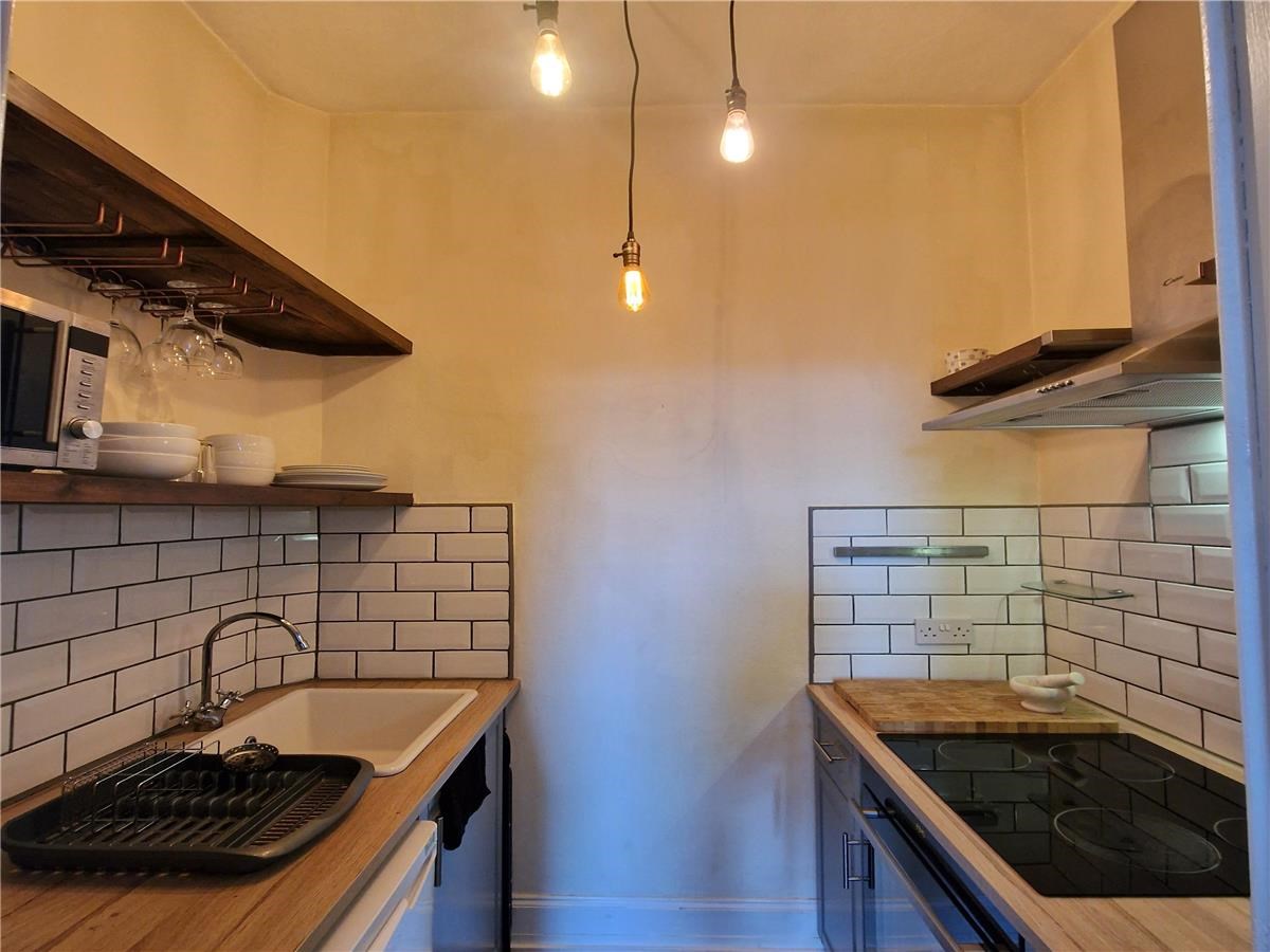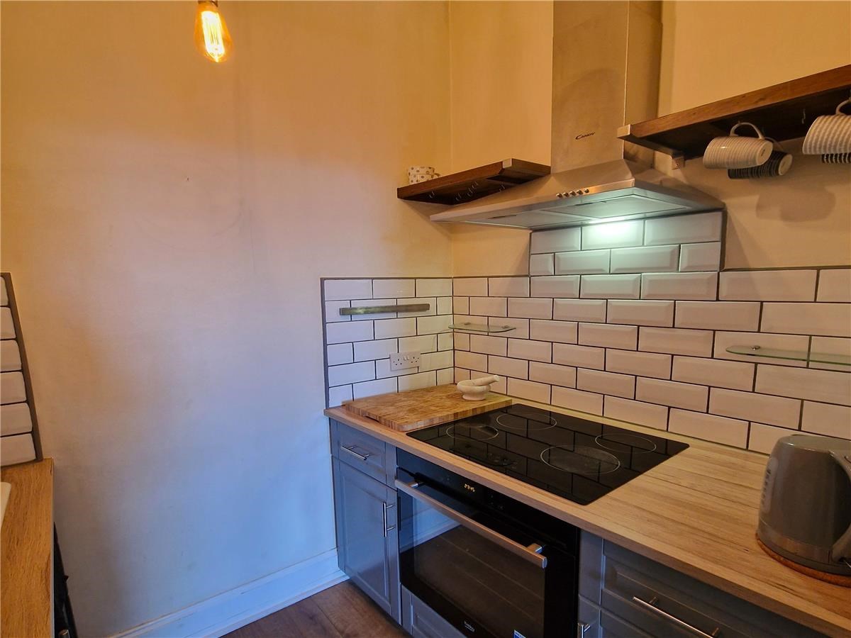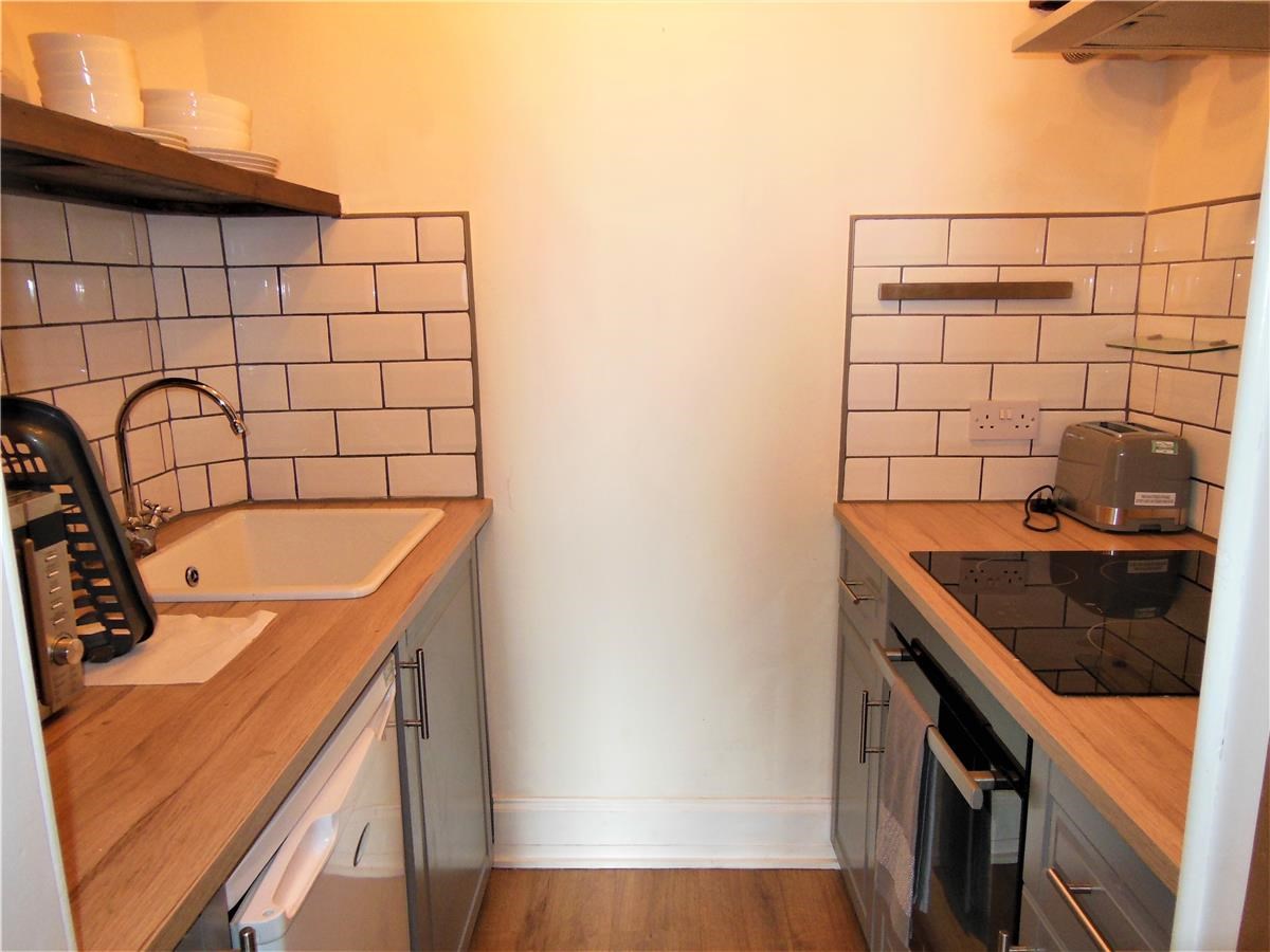 Modern fitted kitchen off lounge with white under counter fridge, under counter freezer, washing machine and integrated hob and oven. Large double bedroom and modern fitted shower room.