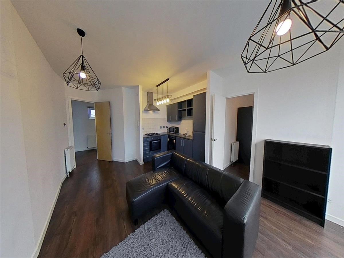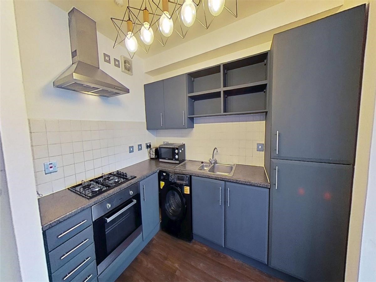 This fully furnished apartment offers a bright and airy living experience, centered around a spacious open-plan lounge and kitchen. Large double glazed windows flood the space with natural light, highlighting a modern kitchen equipped with a countertop gas hob, extractor fan, and generous storage.