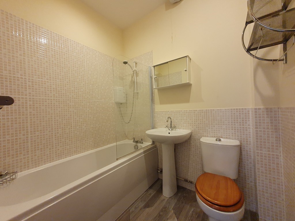 BATHROOM Modern three piece white suite with shower over bath complete with white tiles and wet wall.