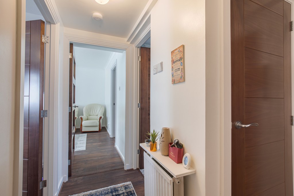 BEDROOM 2 The second bedroom for this property is located round the corner to the right as you enter through the front hallway and offers a lovely bright and welcoming space for winding down and relaxing. A pair of tall mirrors cover a well-designed wardrobe offering a practical and stylish space to store all of your favourite outfits.