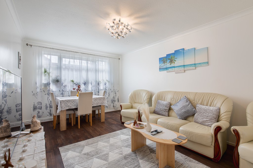 LIVING ROOM This living and dining area feels warm, inviting, and beautifully balanced between comfort and style. The generous window allows soft natural light to filter through the elegant sheer curtains, creating a bright yet cozy atmosphere throughout the space. The seating area looks especially welcoming, with plush sofas and coordinating cushions that offer both comfort and a touch of sophistication.