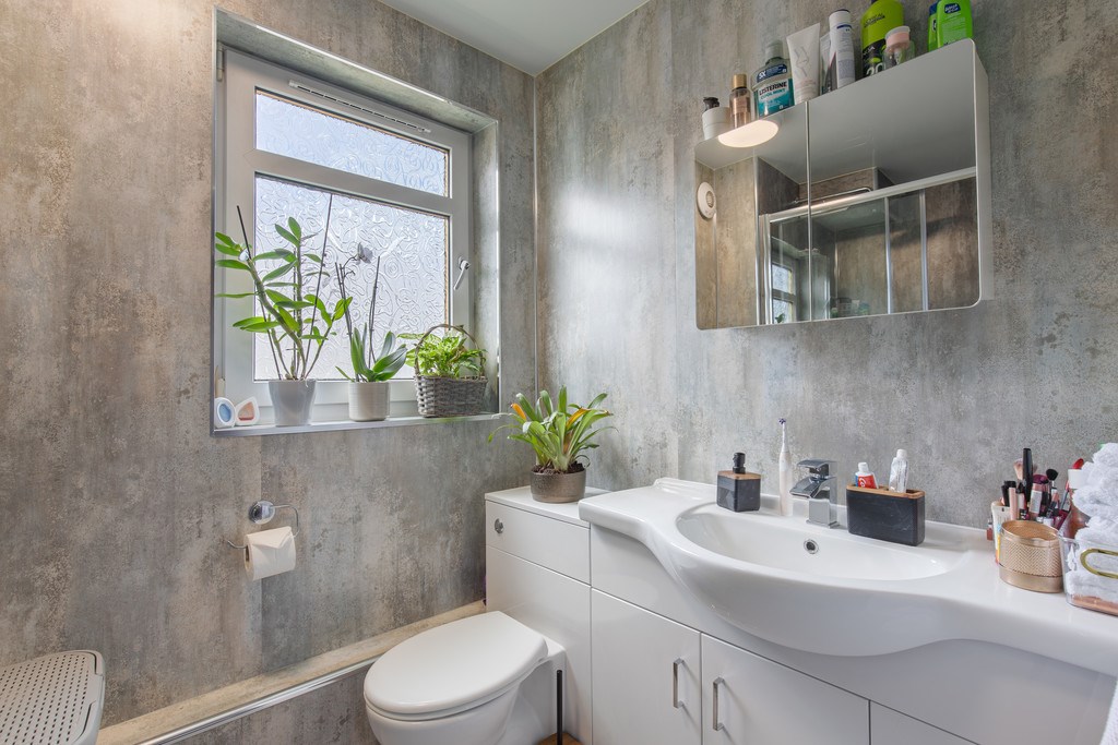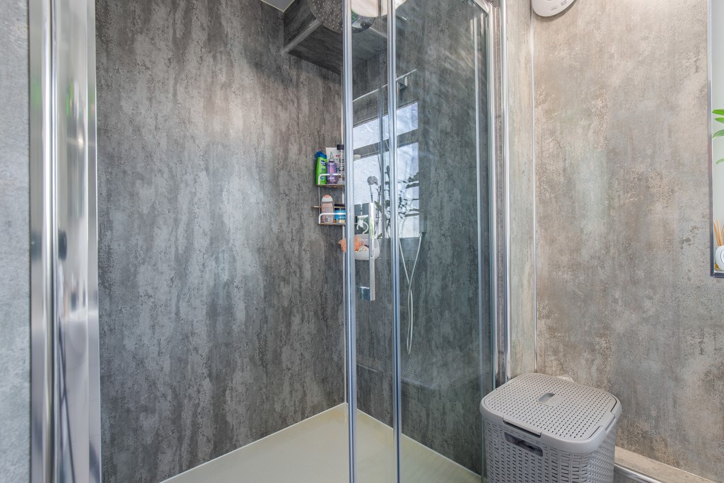 BATHROOM This bathroom has a stylish, contemporary feel with a distinctive and modern finish. The textured wall surfaces give the room a unique, almost spa-like atmosphere, adding depth and character while maintaining a calm, neutral palette. The walk-in shower really adds a touch of class here and brings together what is a very well put together bathroom space.