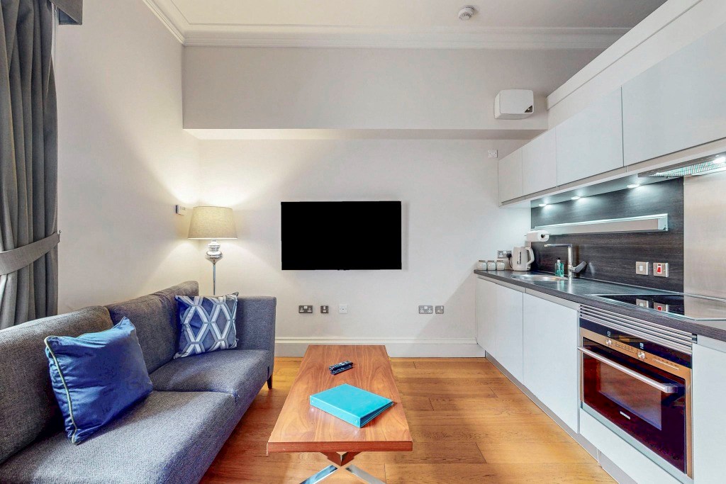 Inside, the apartment features a beautifully designed open-plan living and kitchen area, thoughtfully furnished to balance style and function. The lounge space is warm and inviting, complete with a comfortable sofa, smart TV, and plenty of natural light, ideal for relaxing after a day in the city.