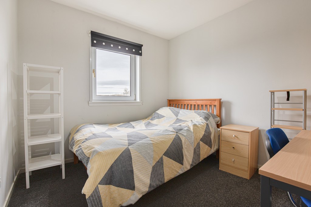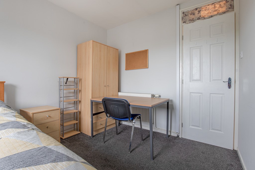 BEDROOM 2 A practical and cosy bedroom offering a bed, a study desk with drawers, and a comfortable chair-ideal for students or professionals working from home. The built-in wardrobe provides ample storage, while the shelving unit and bedside drawers add further convenience. The room enjoys good natural light and features simple, neutral décor for a clean, tidy look.