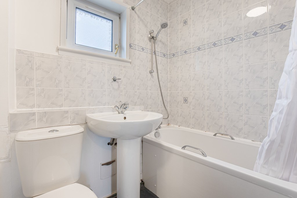 BATHROOM A clean and practical bathroom fitted with a full-sized bathtub with overhead shower, pedestal sink, and WC. The room is finished with patterned wall tiles and includes a frosted window for both privacy and daylight. A simple, functional space that meets all everyday needs.
