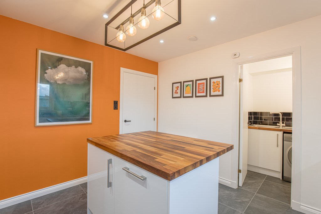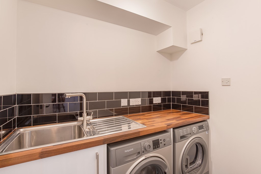 KITCHEN The kitchen area for this property features a very stylish modern design with an island in the centre offering an extra bistro style dining space. With sleek white cupboard and a bright interior, the kitchen is complete with fridge freezer, two-tier oven and stacks of storage cupboards for all your favourite crockery. The room also grants access to the utility room containing a sink area, washing machine and tumble dryer