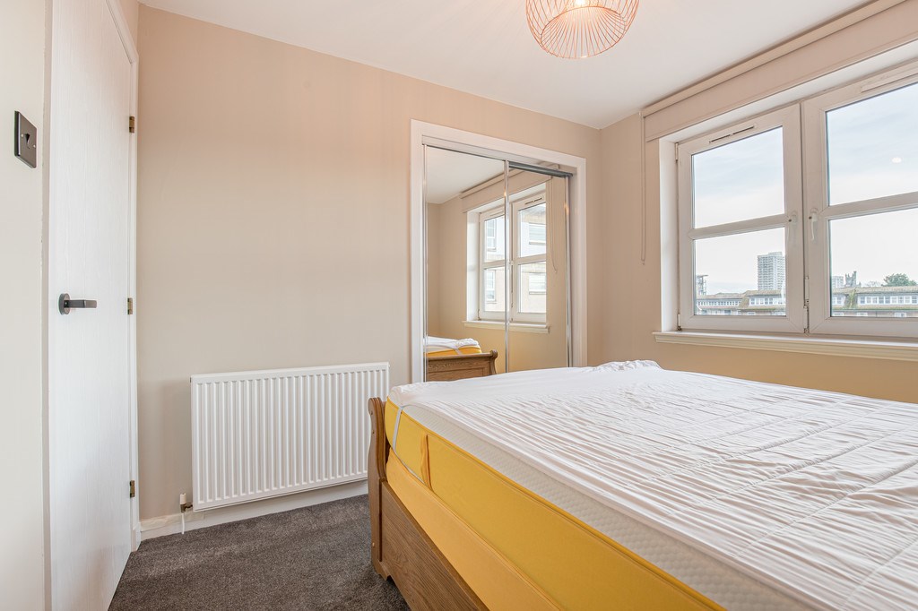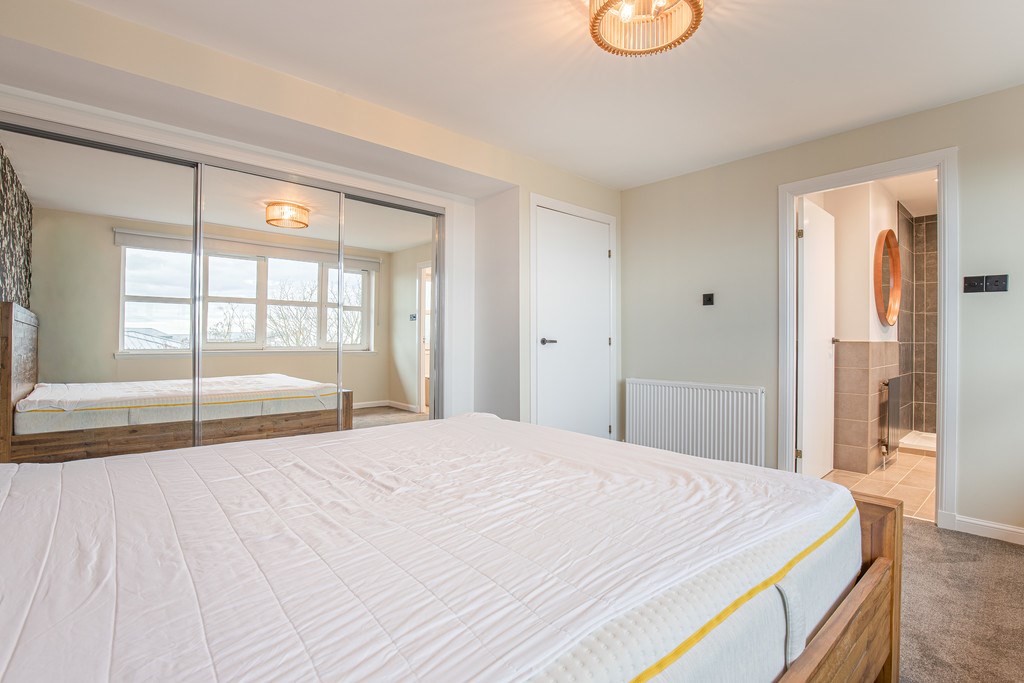 BEDROOM 1 The main bedroom for this property greets you with a cosy grey carpet flooring scheme and features a spacious ensuite bathroom. 4 large street-facing windows allow the room to be filled with light and this light shines across to a generously sized triple panel glass mirror wardrobe. The room is completed by a king mattress resting a rustically designed wooden bedframe.