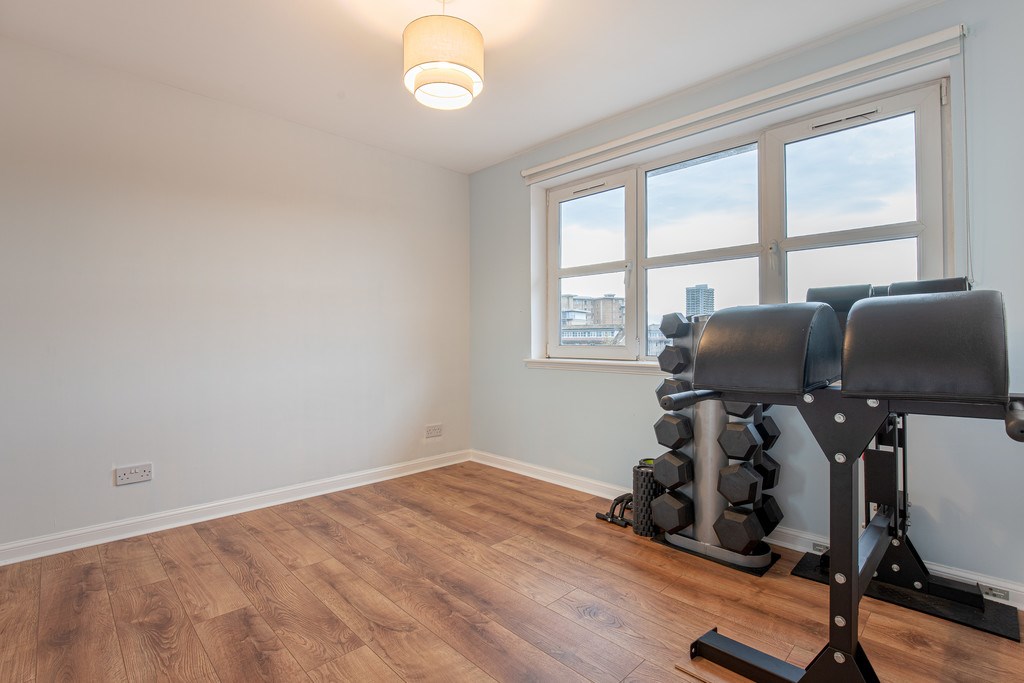 BEDROOM 3 This room is located in the top corner of the property and features a sleek wooden panel flooring scheme. The room has been previously designated as a home gym, and inside you will find a nice amount of space, featuring a dumbbell rack and abdominal sit up apparatus.