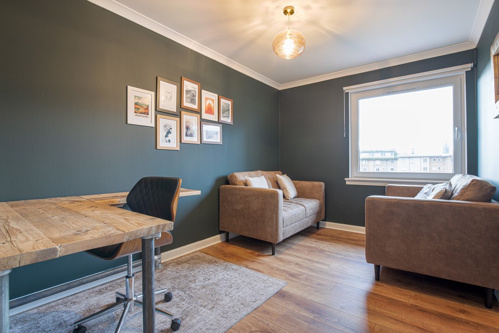 STUDY This room is located just to the left as you enter the property and contains two welcoming opposite-facing leather sofas and is completed with an L shaped desk that is neatly tucked away into the corner and provides a brilliantly comfortable nook to drift away from the outside world and get some work done.