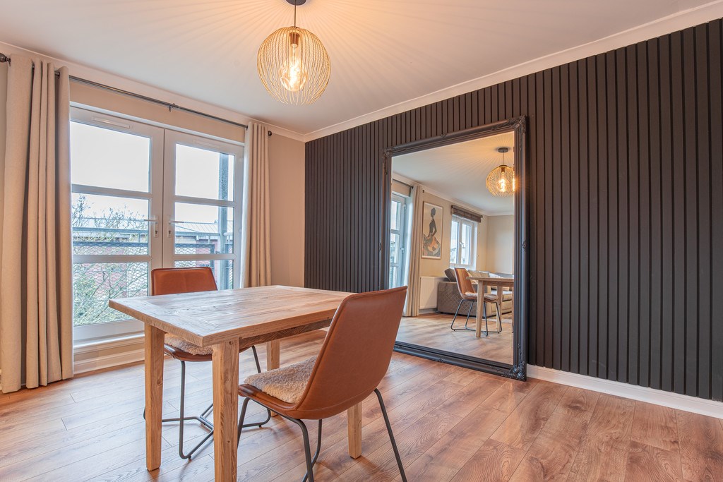 LIVING ROOM The living room for this property is located just to the right as you enter and features a lovely spacious area that doubles us as a dining space. Complete with a cosy sofa, large mirror and balcony view, the room is completed by a sleek wooden panel flooring scheme.