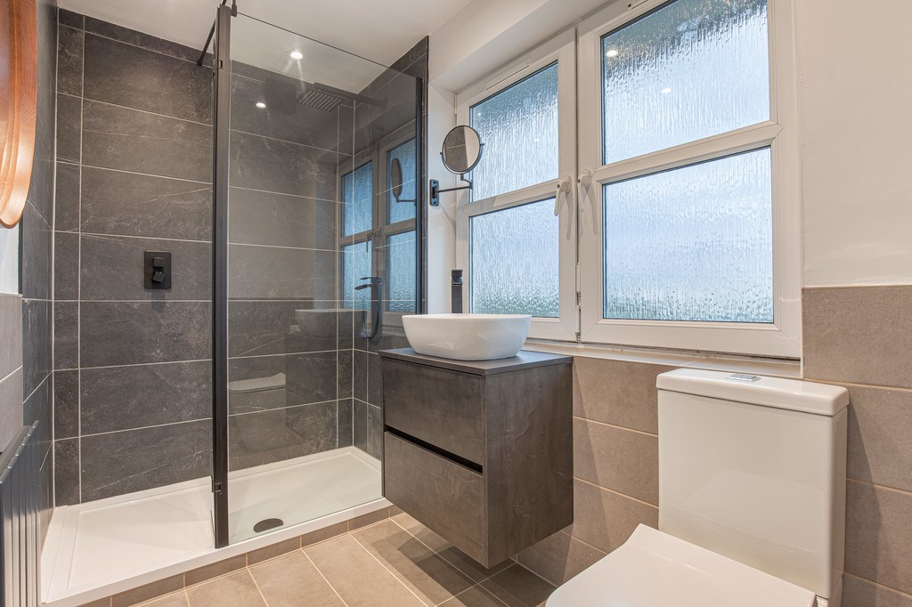 BATHROOM This bathroom offers a modern yet tranquil design and provides a washing space that is fit for any tenant. The room features a large sink area and accompanying storage cupboard below, a six-tier heated towel rail, shiny porcelain toilet, and a huge bathtub that doubles up as a shower area.