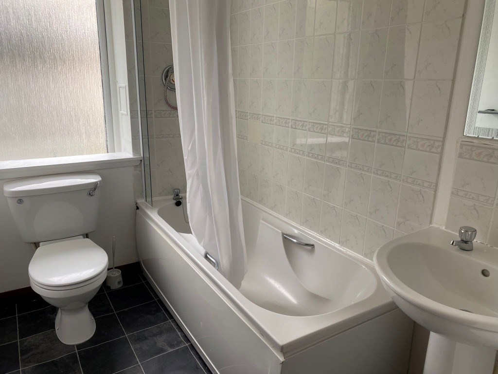 Bathroom: well proportioned bathroom featuring a white three piece suite comprising of W.C., wash hand sink with pedestal and bath with electric shower over