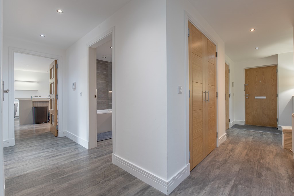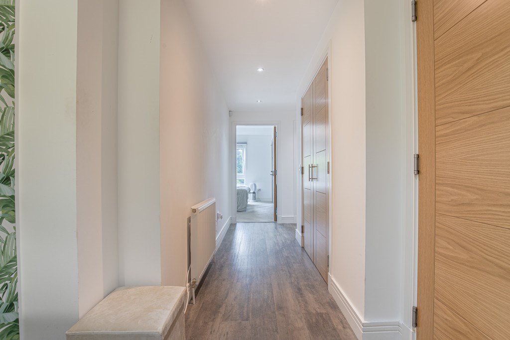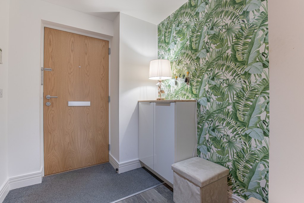 HALLWAY The hallway of this property makes a welcoming first impression with its bright and contemporary finish. On entry, a feature wall with fresh green botanical wallpaper adds a stylish touch, complemented by neutral décor and wood-effect flooring that runs throughout. The space feels open and airy, with multiple doors leading to the main living areas, bedrooms, and bathroom. Practical storage is provided by built-in cupboards, ideal for coats and household essentials, while recessed ceiling spotlights enhance the modern feel. The layout flows seamlessly, giving a clear line of sight through to the living space and ensuring the hallway is both functional and inviting.