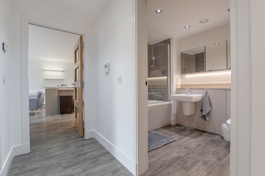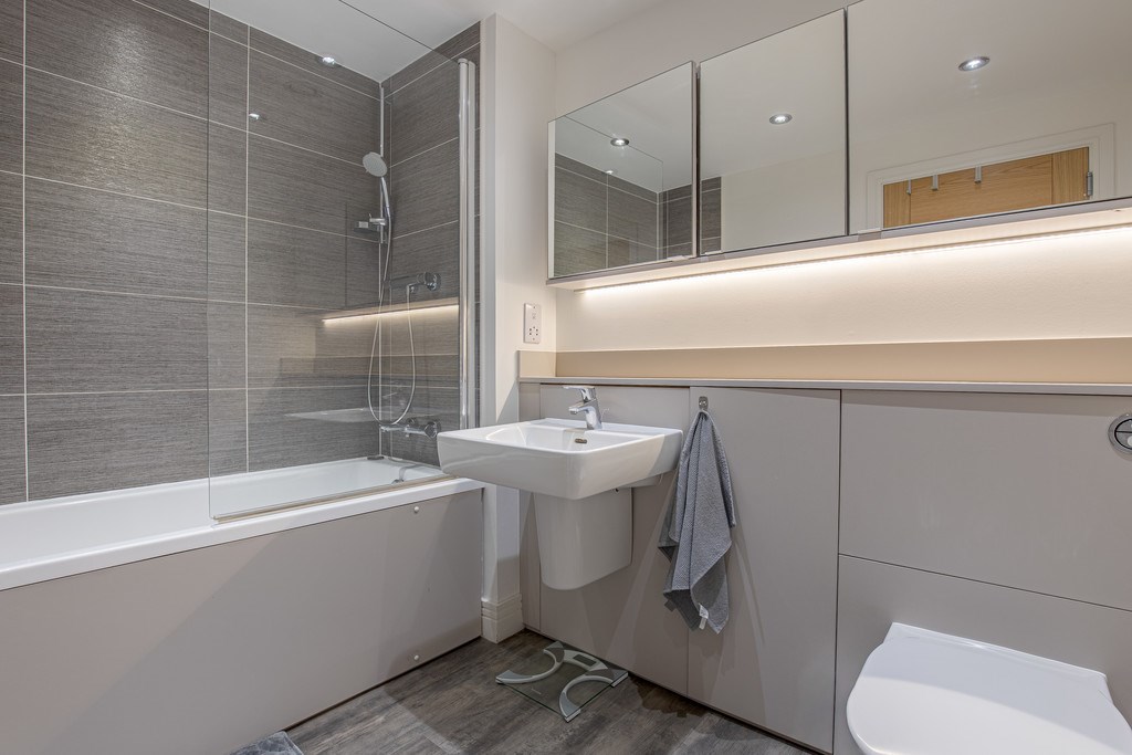 BATHROOM The family bathroom is finished to a high modern standard, combining both style and practicality. Featuring a sleek three-piece suite, it includes a full-sized bathtub with overhead shower and glass screen, a contemporary wall-mounted wash basin, and a concealed cistern WC with built-in storage. The walls are partially tiled with a smart grey textured finish, giving the room a sophisticated and timeless look, while recessed spotlights and an illuminated mirrored cabinet enhance the bright and airy feel. Ample storage is neatly integrated into the vanity units, ensuring a clutter-free space. This bathroom provides a perfect blend of comfort and convenience, ideal for everyday family living.