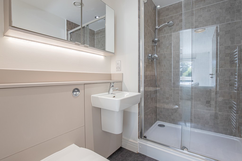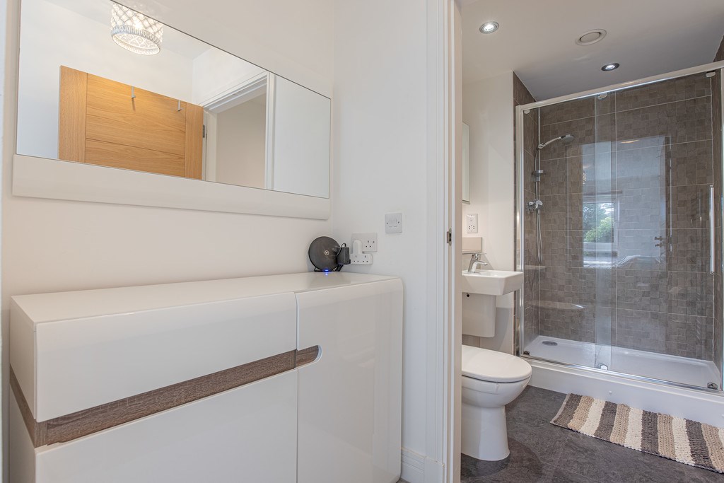 BEDROOM 1 (MASTER BEDROOM) The master suite is a bright and generously sized room designed with comfort and style in mind. A large window fills the space with natural light and provides a pleasant outlook over the surrounding greenery, creating a calm and relaxing atmosphere. The neutral décor is complemented by soft carpeting underfoot, while a modern feature light fitting adds a touch of elegance. Practical storage is provided by mirrored fitted wardrobes, maximising both space and functionality. The suite also benefits from a contemporary en-suite shower room, finished to a high standard with sleek tiling, a walk-in shower enclosure with glass screen, a modern vanity unit with storage, and a wall-mounted mirror with integrated lighting. Altogether, the master suite offers a private and stylish retreat within this superb apartment.