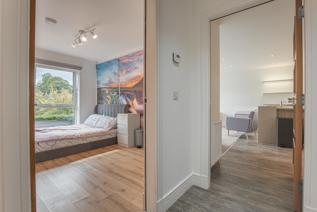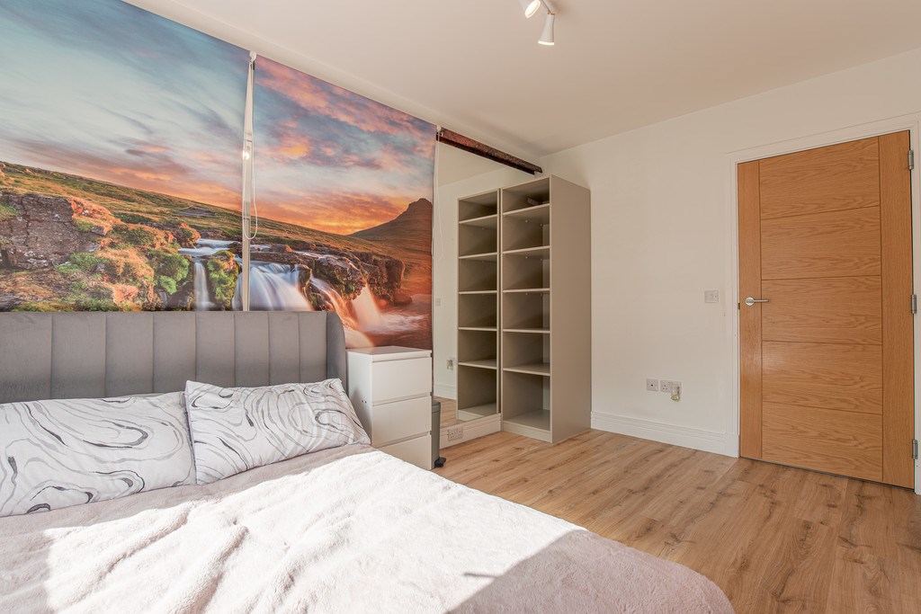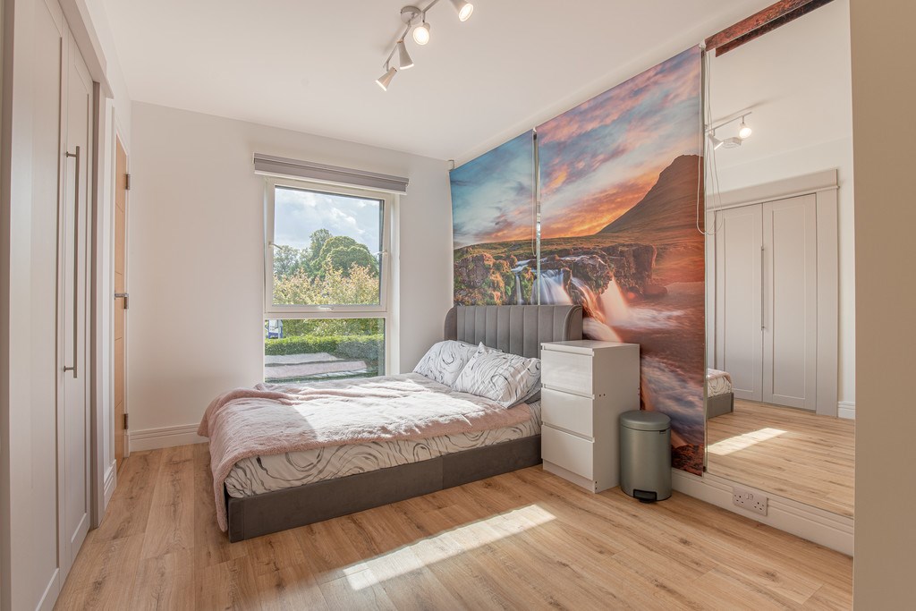 The room is well proportioned, easily accommodating a double bed alongside additional furnishings, and features fitted wardrobes providing excellent storage solutions. A striking feature wall with a scenic mural adds a unique and vibrant character to the space, making it both practical and full of personality. This bedroom would be ideal as a comfortable guest room, children's room, or even a stylish home office.