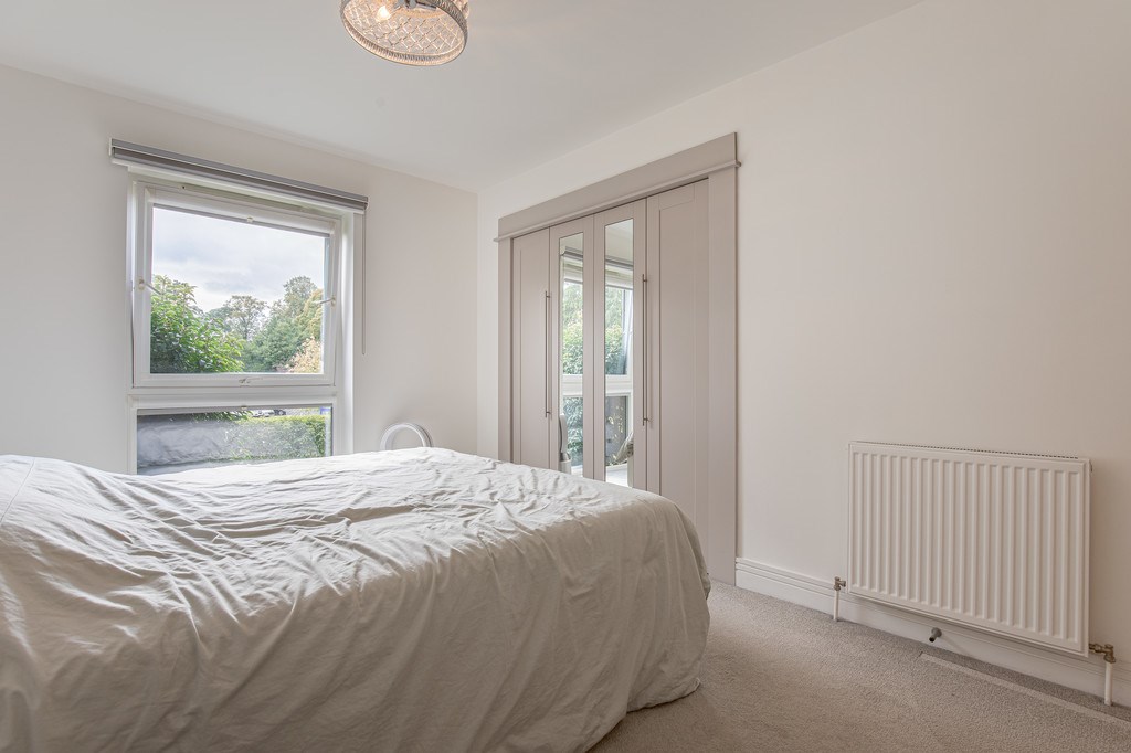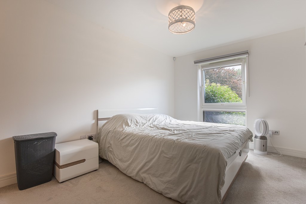 BEDROOM 2 The second bedroom is a bright and generously sized room, finished in neutral tones with attractive wood-effect flooring that adds warmth and style. A large window allows in plenty of natural light while offering a pleasant outlook over the surrounding greenery, creating a fresh and inviting atmosphere.