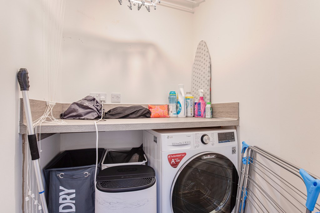 UTILLITY The utility area is a highly practical space, thoughtfully designed to keep household tasks neatly tucked away from the main living areas. It is fitted with a modern washing machine and dryer, with additional shelving above providing handy storage for laundry essentials, cleaning products, and everyday items. There is also space for laundry baskets, an ironing board, and a clothes airer, making it a functional hub for organisation. Finished in neutral tones with a durable design, this area ensures that laundry and household chores can be managed efficiently without encroaching on the home's main living spaces.