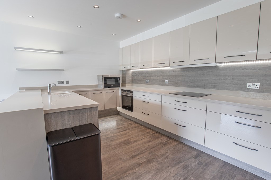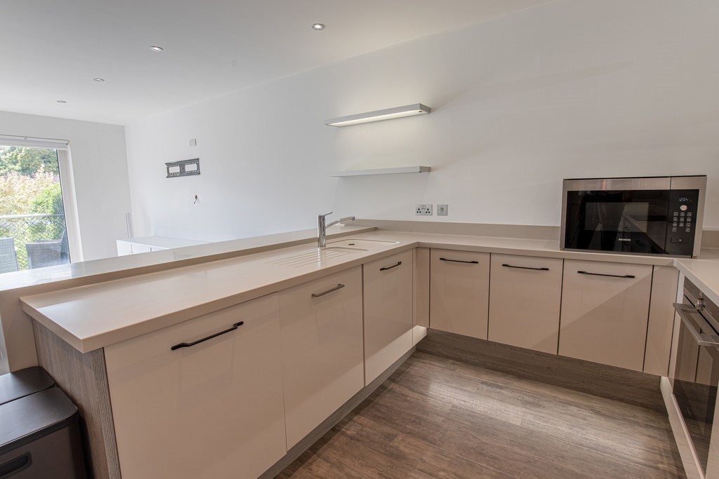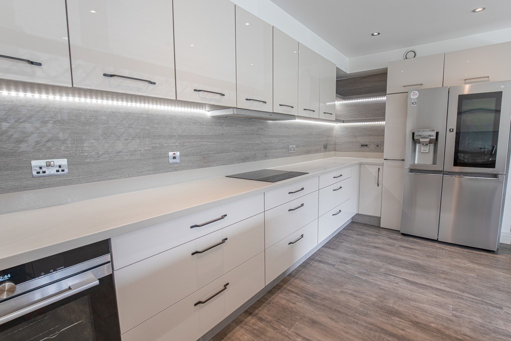 OPEN PLAN LIVING/KITCHEN The open plan kitchen and living area is a bright, stylish, and sociable space, perfectly designed for modern living. The kitchen is beautifully appointed with sleek high-gloss cabinetry, generous worktop space, and integrated appliances, all enhanced by subtle under-cabinet lighting for a contemporary finish. A breakfast bar separates the kitchen from the lounge, offering an ideal spot for casual dining or entertaining.