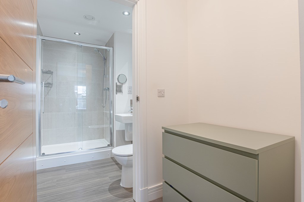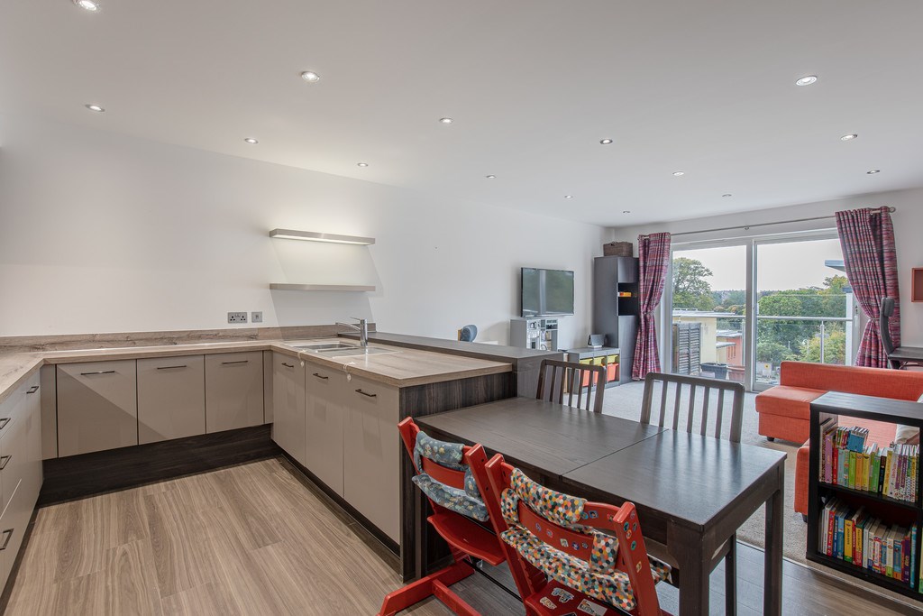 OPEN PLAN LIVING/KITCHEN The open plan living and kitchen area offers a bright, contemporary space finished to a high standard throughout. The modern kitchen is fitted with sleek, handle less units, integrated appliances, and ample worktop and storage space - ideal for everyday living and entertaining. The living area provides a spacious and flexible layout with room for both lounge and dining furniture, featuring large patio doors that flood the space with natural light. These open out onto a private balcony, perfect for enjoying fresh air and open views across the landscaped development. Presented unfurnished, this inviting open-plan area allows tenants to make the space their own while enjoying a stylish, modern setting with a seamless flow between kitchen, dining, and relaxation zones.