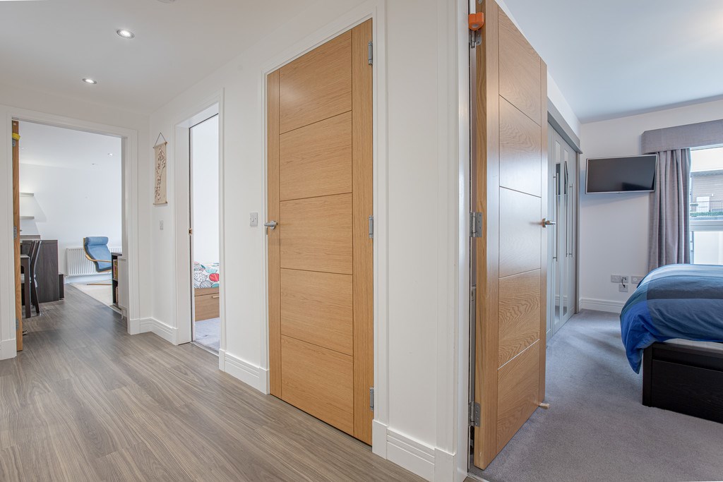 HALLWAY The hallway presents a bright and modern entrance to the property. Upon entry, you're greeted with sleek wood-effect flooring that extends throughout, complemented by fresh white walls and recessed ceiling spotlights that enhance the sense of space and light. There are two storage cupboards with contemporary oak-style double doors one acting as a utility room, offering practical storage solutions. The hallway provides access to the bathroom, bedrooms, and open-plan living area, which can be seen through part-glazed oak doors that add warmth and a touch of sophistication to the space.
