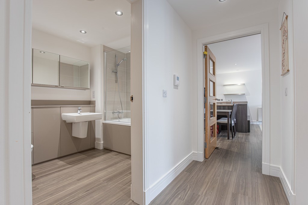 FAMILY BATHROOM The family bathroom is finished to a high modern standard, featuring neutral tones and sleek fittings throughout. It comprises a full-sized bath with an overhead shower and glass screen, ideal for both relaxing baths and convenient showers. A wall-mounted sink and WC are set against stylish fitted cabinetry, providing ample concealed storage and maintaining a clean, contemporary look. A large mirrored vanity unit above the sink enhances the sense of space and light, while the wood-effect flooring and recessed lighting add a touch of warmth and sophistication.