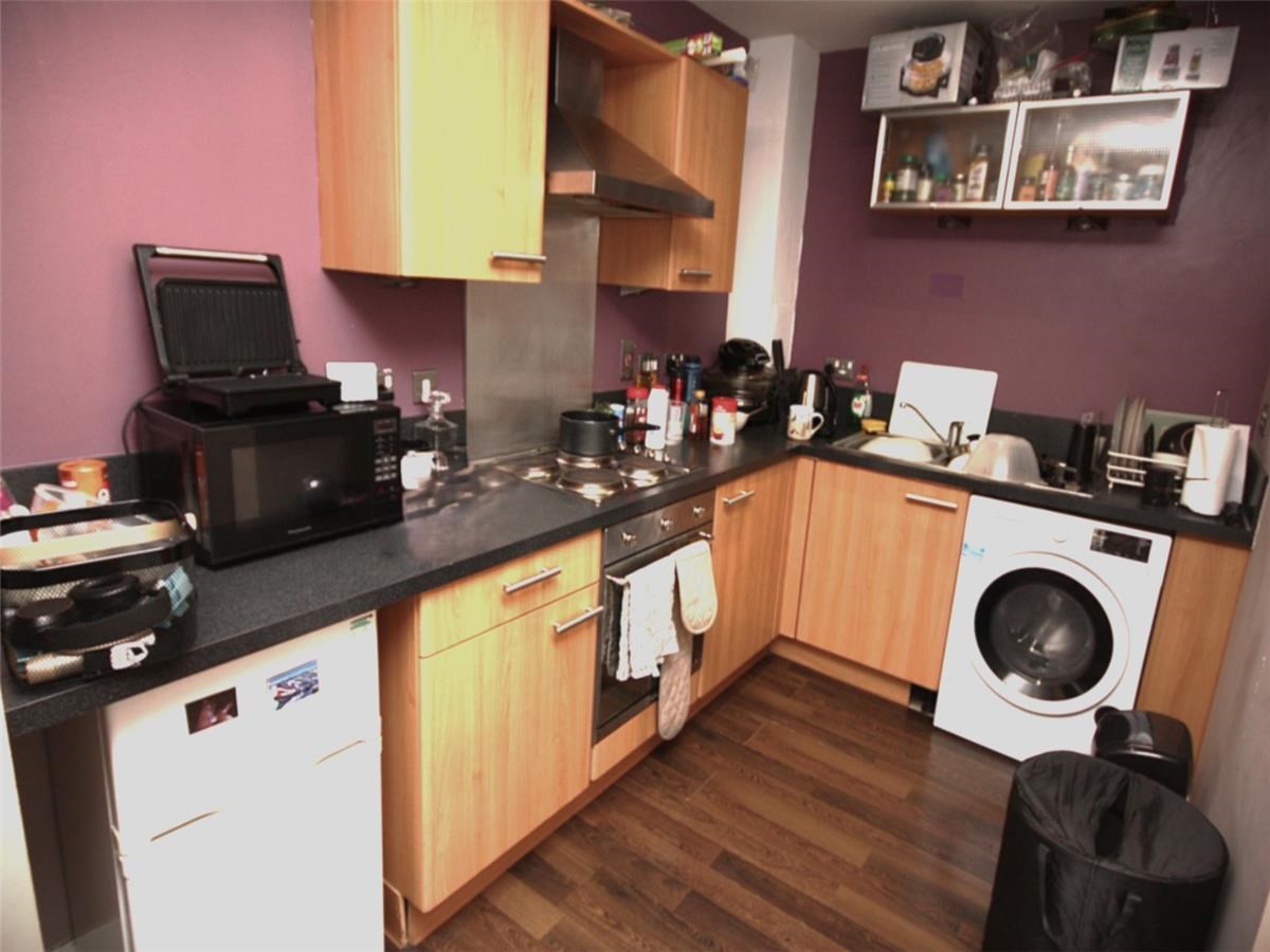 - A large bright living, dining and kitchen space with Fridge, Washing machine and other kitchen items