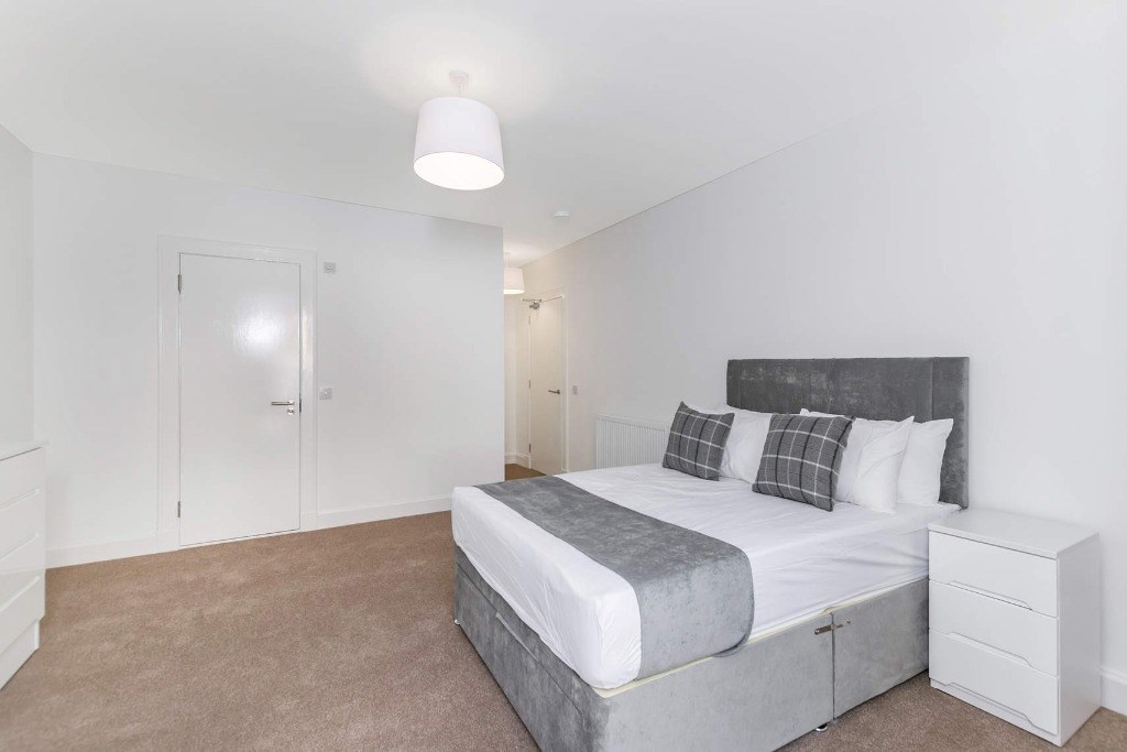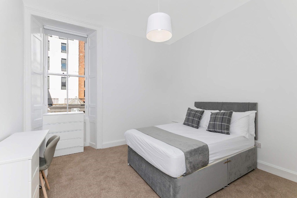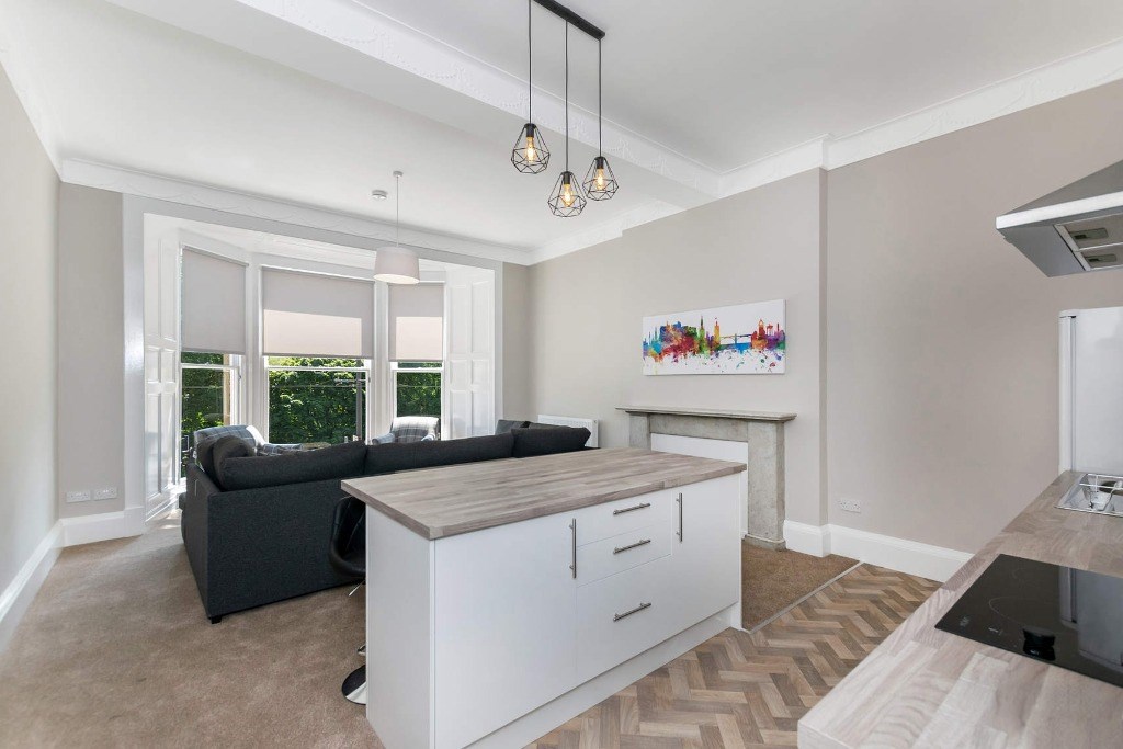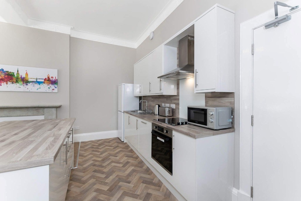 Upon entering, a spacious and welcoming carpeted hallway provides excellent storage and leads to the impressive open-plan living, dining, and kitchen area. This magnificent room is enhanced by a large bay window framing breathtaking views of Edinburgh Castle, and features original Georgian detailing, including a refined feature mantel.