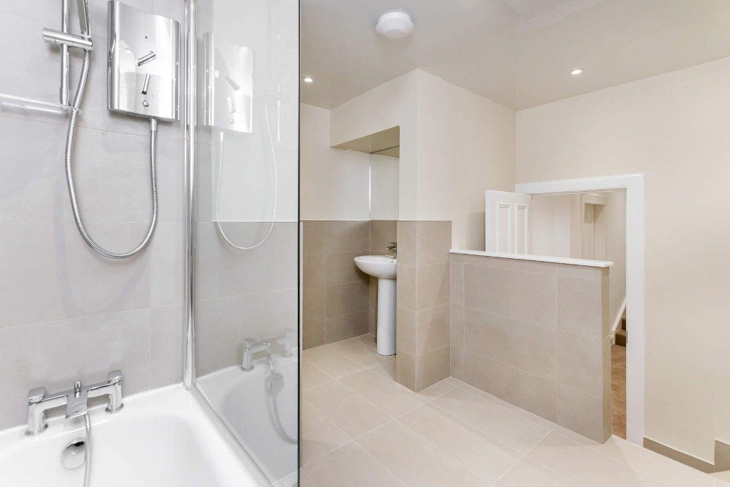 Completing the accommodation, the elegant family bathroom is fully tiled and features a three-piece suite comprising a vanity basin, WC, and a walk-in shower enclosure with contemporary fittings.
