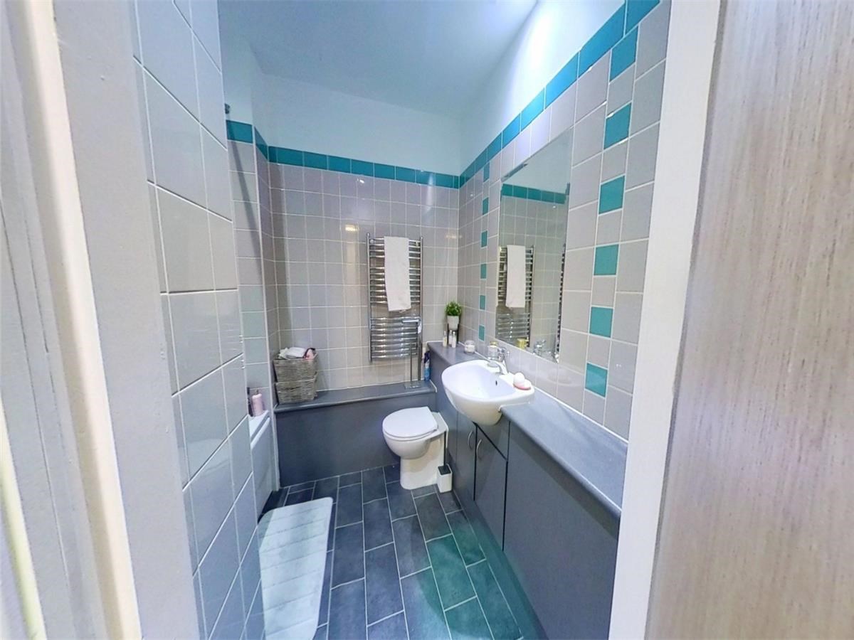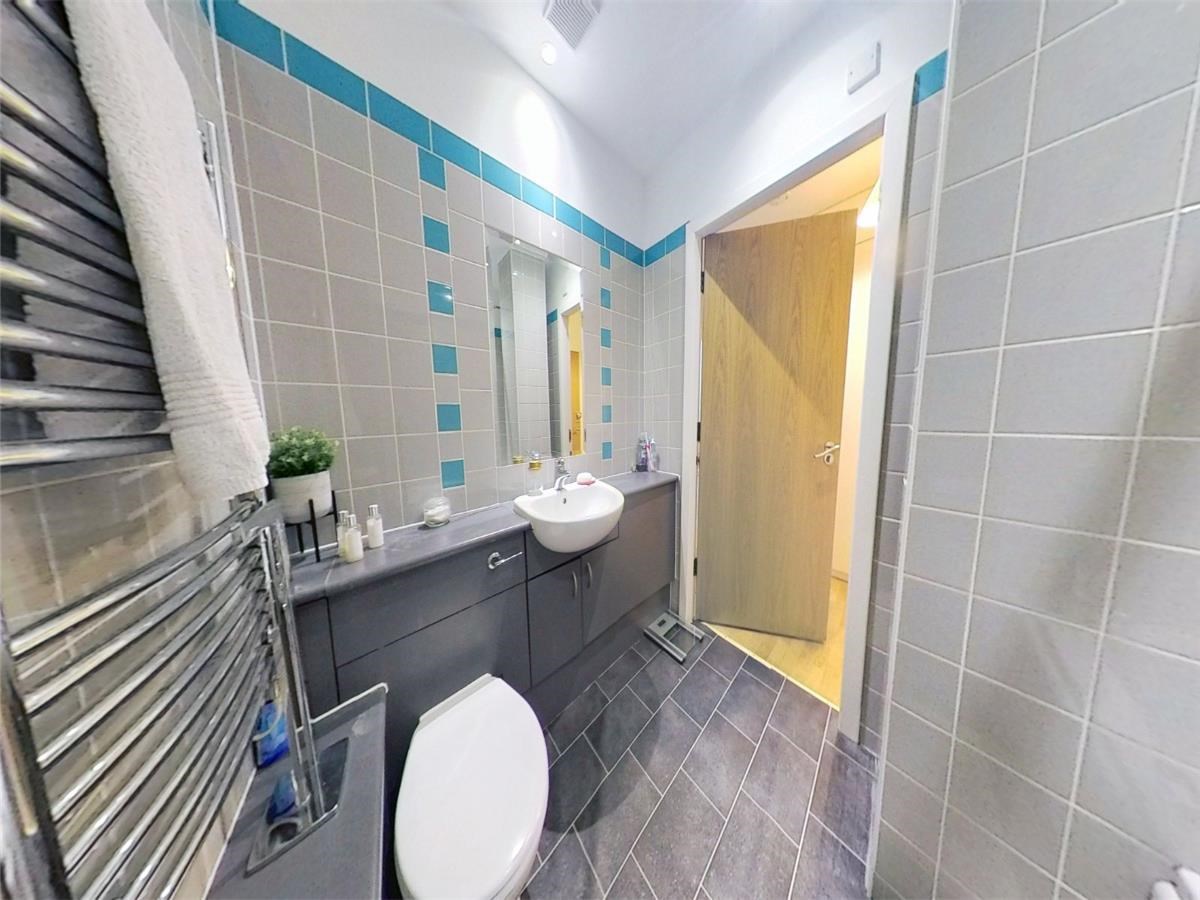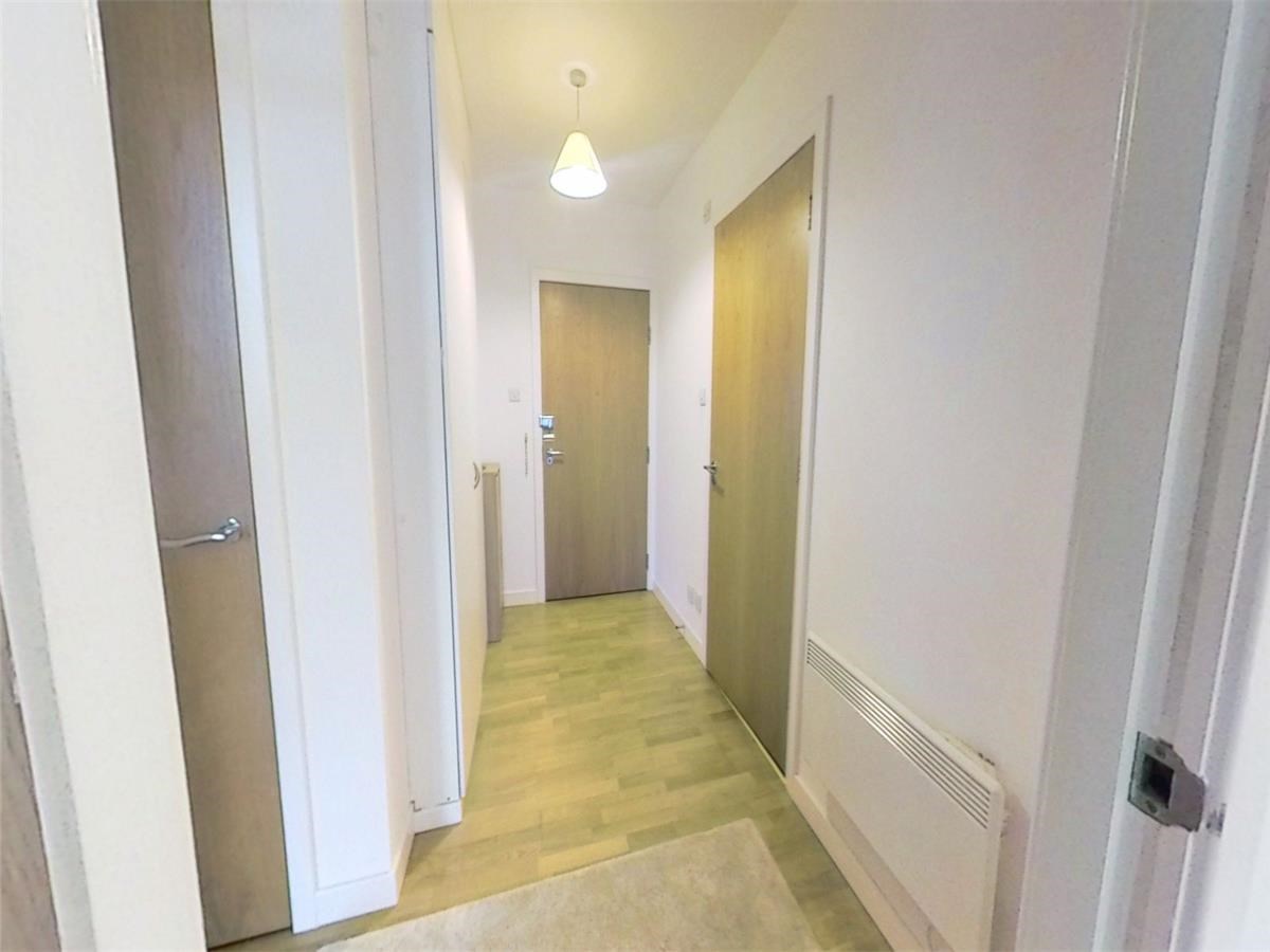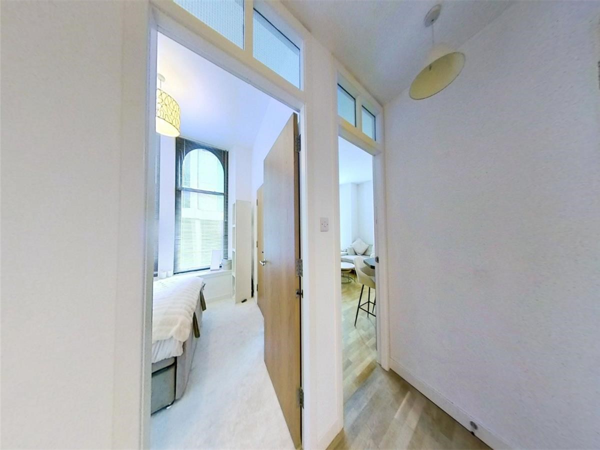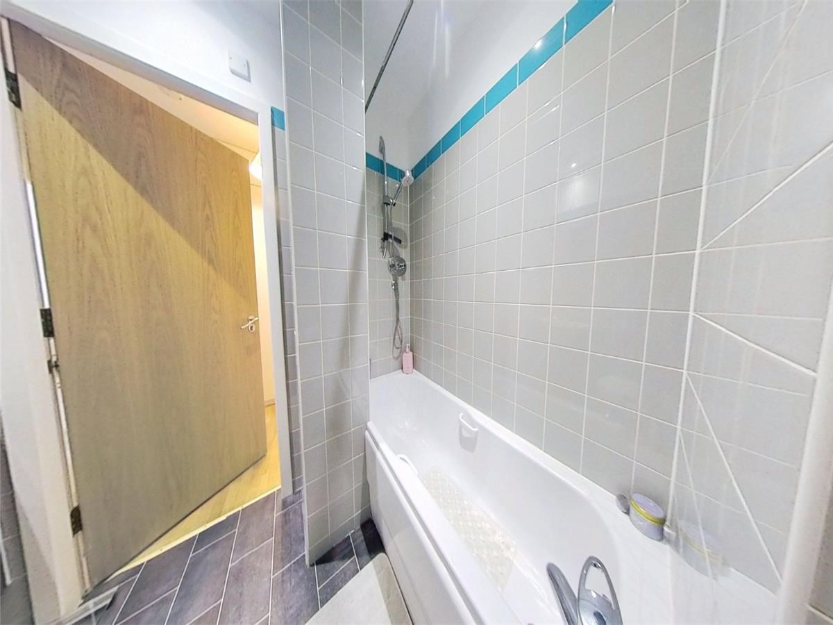 Internally, the property comprises a generously proportioned entrance hallway featuring floor-to-ceiling integrated storage- ideal for coats, shoes, and general household items. To the left of the hallway, you'll find a contemporary three-piece bathroom suite, complete with a shower over bath, heated towel rail, and a mirrored vanity unit. The bathroom is finished with modern tiling and is well-lit, enhancing the sleek, clean design. Leading on, you're welcomed into a bright and spacious open-plan living and kitchen area, flooded with natural light thanks to the dual aspect bay windows. The living space is decorated in neutral tones and furnished with modern, minimalistic furniture, creating a calm and inviting atmosphere. To the rear of the lounge is a stylish, L-shaped fully fitted kitchen, boasting integrated appliances, ample cabinetry, and a breakfast bar that serves as either a casual dining space or additional countertop area. Completing the accommodation is a generously sized double bedroom, also benefiting from floor-to-ceiling integrated wardrobes and large dual aspect bay windows, ensuring the room is both bright and functional.