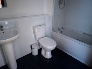 Bathroom: well proportioned bathroom featuring a white three piece suite comprising of W.C., wash hand sink with pedestal and bath with electric shower over