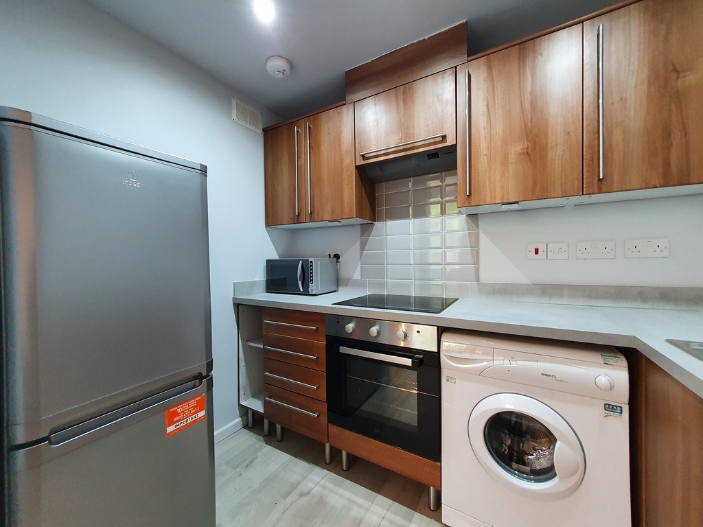 LOUNGE/KITCHEN Beautiful large open plan kitchen and living room area. This modern kitchen is fully equipped with a range of appliances and an electric hob and oven. The wall and base units are white and provide plenty of storage, and the counter tops are grey. The living area includes large Dark brown fabric L shaped sofa, coffee table, side tables and a lovely desk area. This rooms has modern neutral finishes ideal for relaxing.
