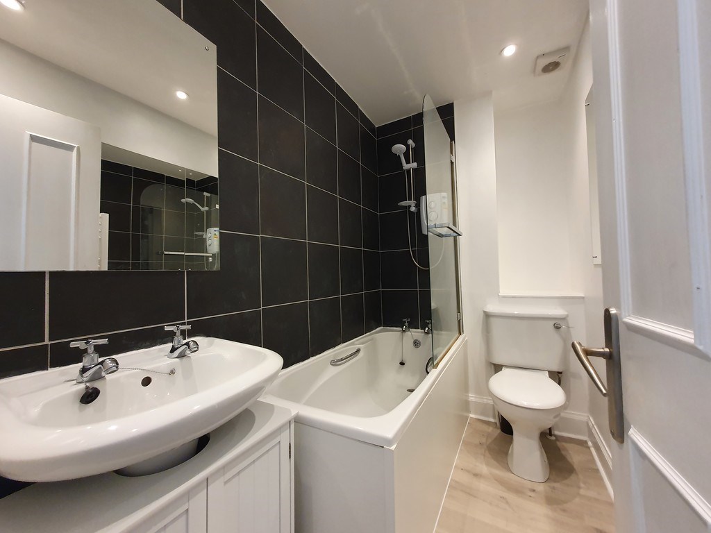 BATHROOM Three piece white bathroom suite with a shower over the bath. cream tiles and black tiled surround makes this room modern.