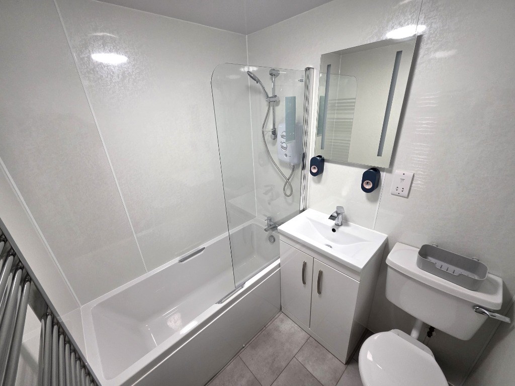 The property comprises of: Lovely bright, open plan, kitchen and living space; good sized double bedroom with storage built in and provided; Modern bathroom with white suite and shower over bath with easy to keep aquapanelled surround.