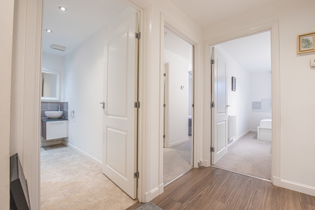 HALLWAY The welcoming entrance hallway provides access to all principal rooms and benefits from wood-effect flooring that continues through the main living spaces. Recessed spotlights create a bright and airy feel, while the layout offers a practical flow throughout the property.